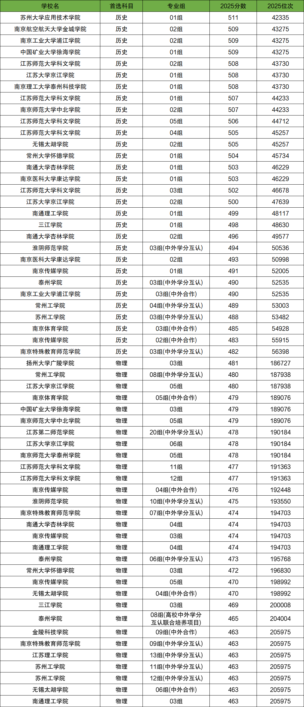 物理科目类收分最低的大学为南通理工学院03组、无锡太湖学院06组(中外合作)、苏州工学院12组(中外学分互认)等,2025年最低分均为463分,位次为205975。