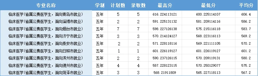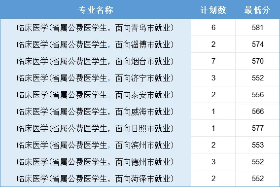 临床医学专业:2023年录取需面向青岛市、淄博市、烟台市、济宁市、泰安市、日照市、滨州市、德州市、菏泽市就业,在菏泽市就业的分数线最低,需要565分。