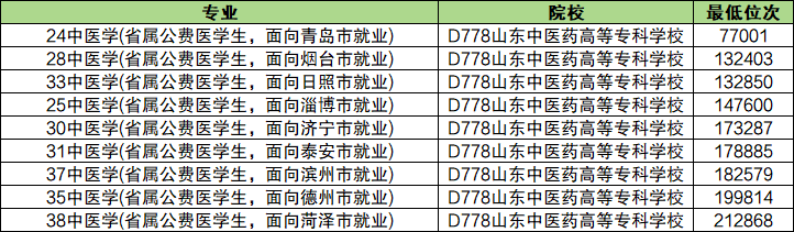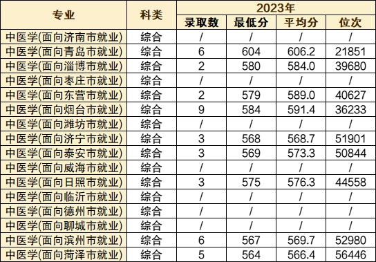 中医学专业:2023年录取需面向青岛市、淄博市、东营市、烟台市、济宁市、泰安市、日照市、滨州市、菏泽市就业,在菏泽市就业的分数线最低,需要564分。