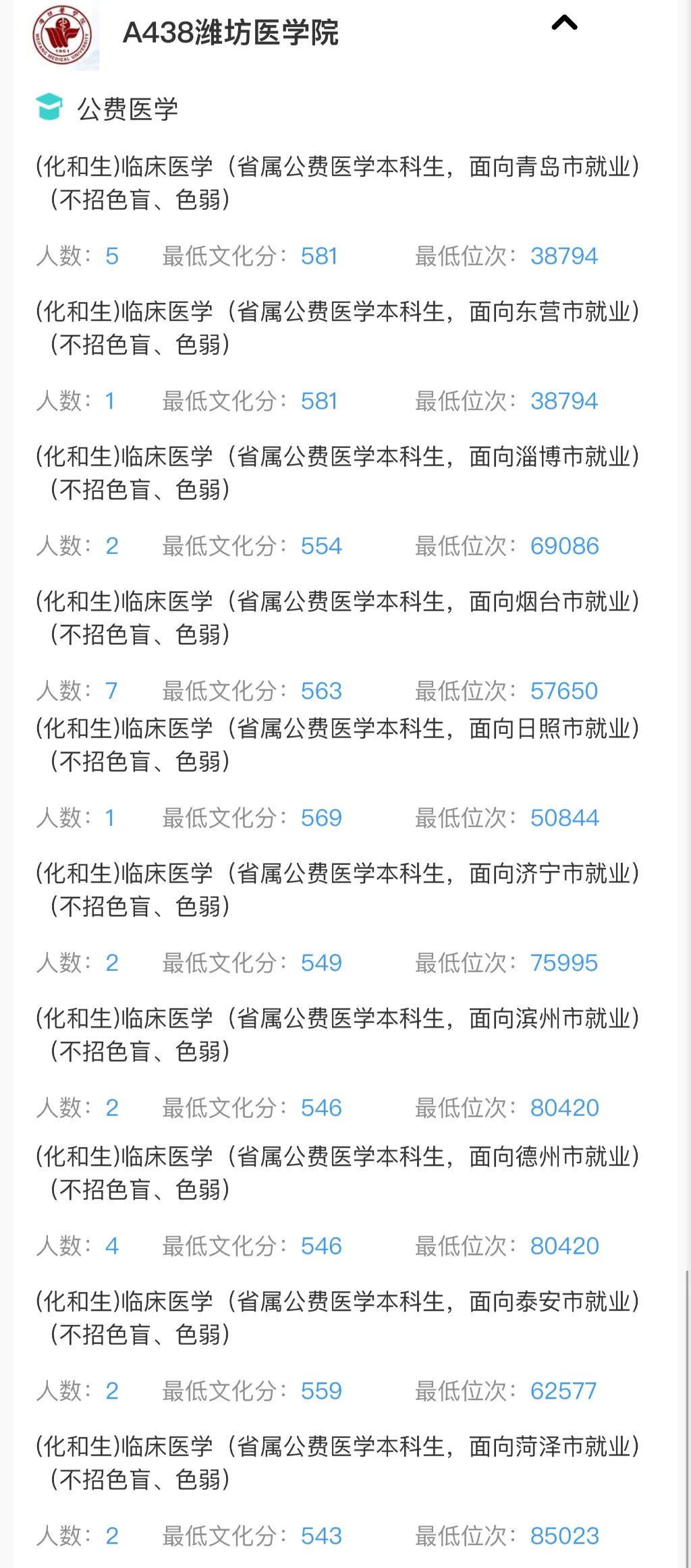 临床医学专业:2023年录取需面向青岛市、淄博市、烟台市、济宁市、泰安市、威海市、日照市、滨州市、、德州市、菏泽市就业,在菏泽市、德州市就业的分数线最低,需要552分。