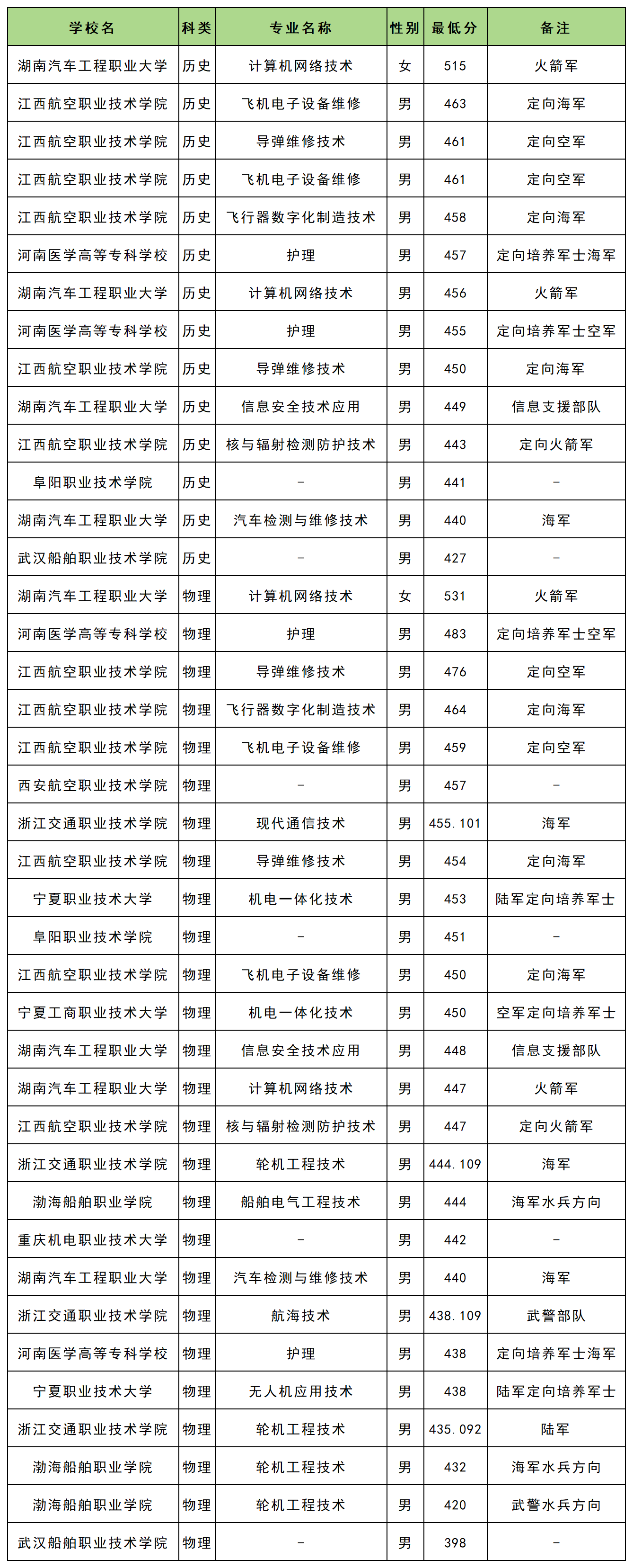 2025年河北定向士官历史类最低线是427分,对应收分最低的学校是武汉船舶职业技术学院。不过这是对于男生而言的,历史类女生最容易上的是湖南汽车工程职业大学的计算机网络技术专业,2025年最低分515分。