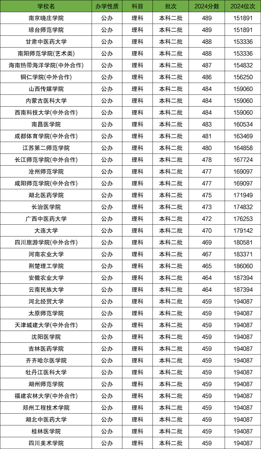 2024年四川省理科本科线(即二本线,下同)为459分。理科考生超过本科线30分能上的全国公办二本大学有南京晓庄学院、琼台师范学院、甘肃中医药大学、山西传媒学院、内蒙古医科大学等。