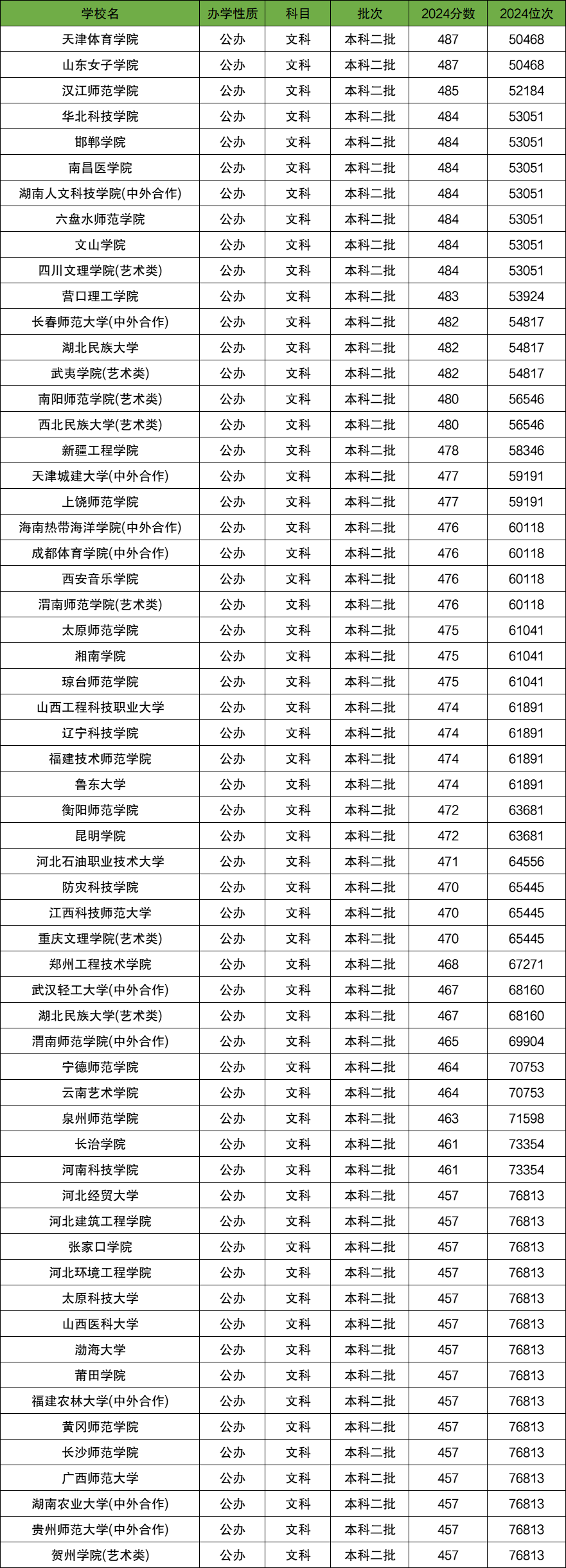 2024年四川省文科本科线为457分。文科考生超过本科线30分能上的全国公办二本大学有天津体育学院、山东女子学院、汉江师范学院、华北科技学院、邯郸学院等。