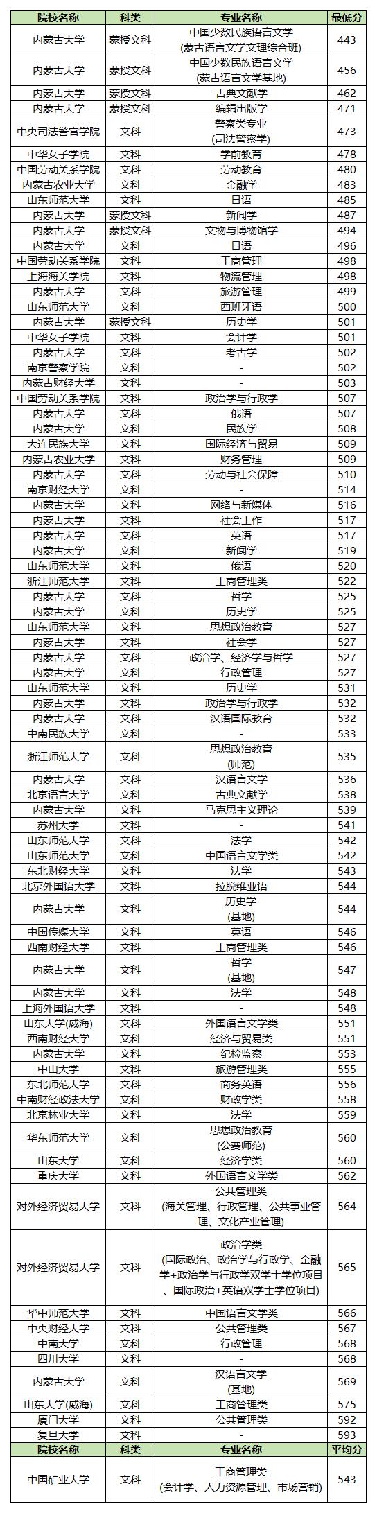 如果文科生分数在500分以下,建议报考:中国劳动关系学院、上海海关学院、中央司法警官学院、内蒙古大学、山东师范大学。
