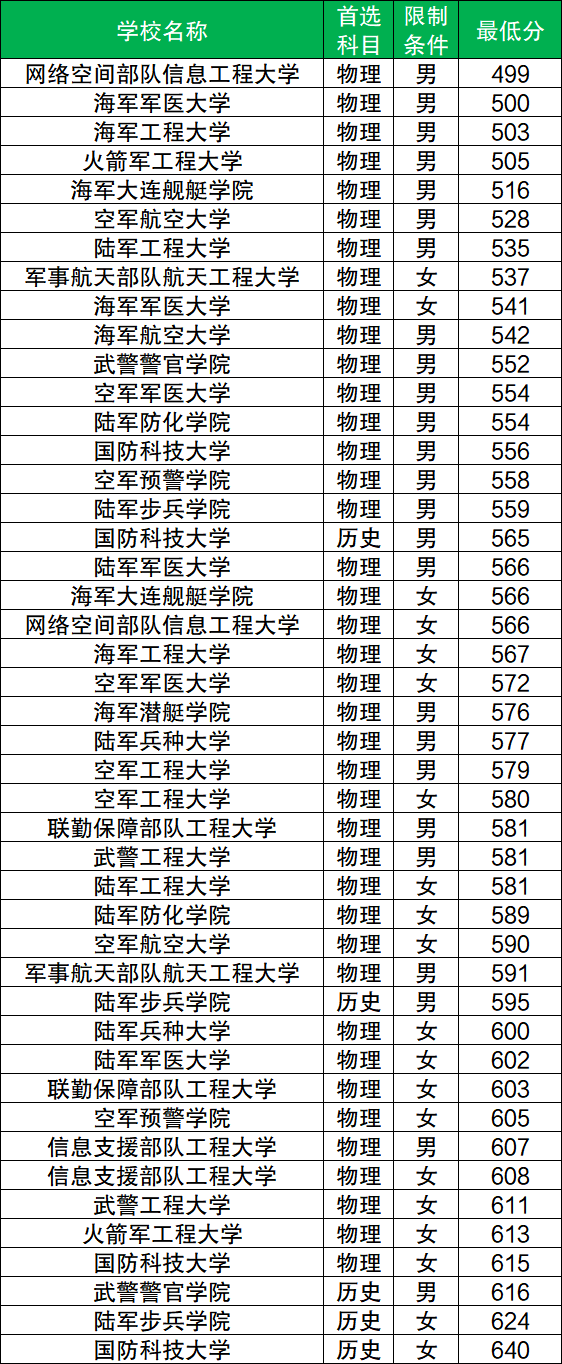 其中物理类男生分数至少在499分及以上、女生分数至少在537分及以上才有机会参与军检进而过关被投档。而男生分数最低的院校是网络空间部队信息工程大学,女生分数最低的院校是军事航天部队航天工程大学。