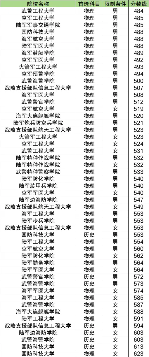 其中物理类男生分数至少在484分及以上、女生分数至少在519分及以上才有机会参与军检进而过关被投档。而男生分数最低的院校是武警工程大学,女生分数最低的院校是空军航空大学。