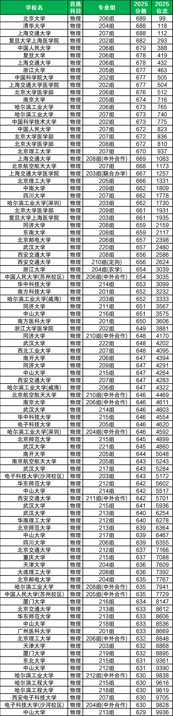 2025年广东物理类位次在1万名以内的考生可以报考的院校专业组共计96个,其中录取位次最低的是中山大学213组(629分,位次9936名),其次是哈尔滨工业大学212组(630分,位次9838名)、电子科技大学(沙河校区)204组(630分,位次9828名)、西安电子科技大学207组(630分,位次9705名)等。