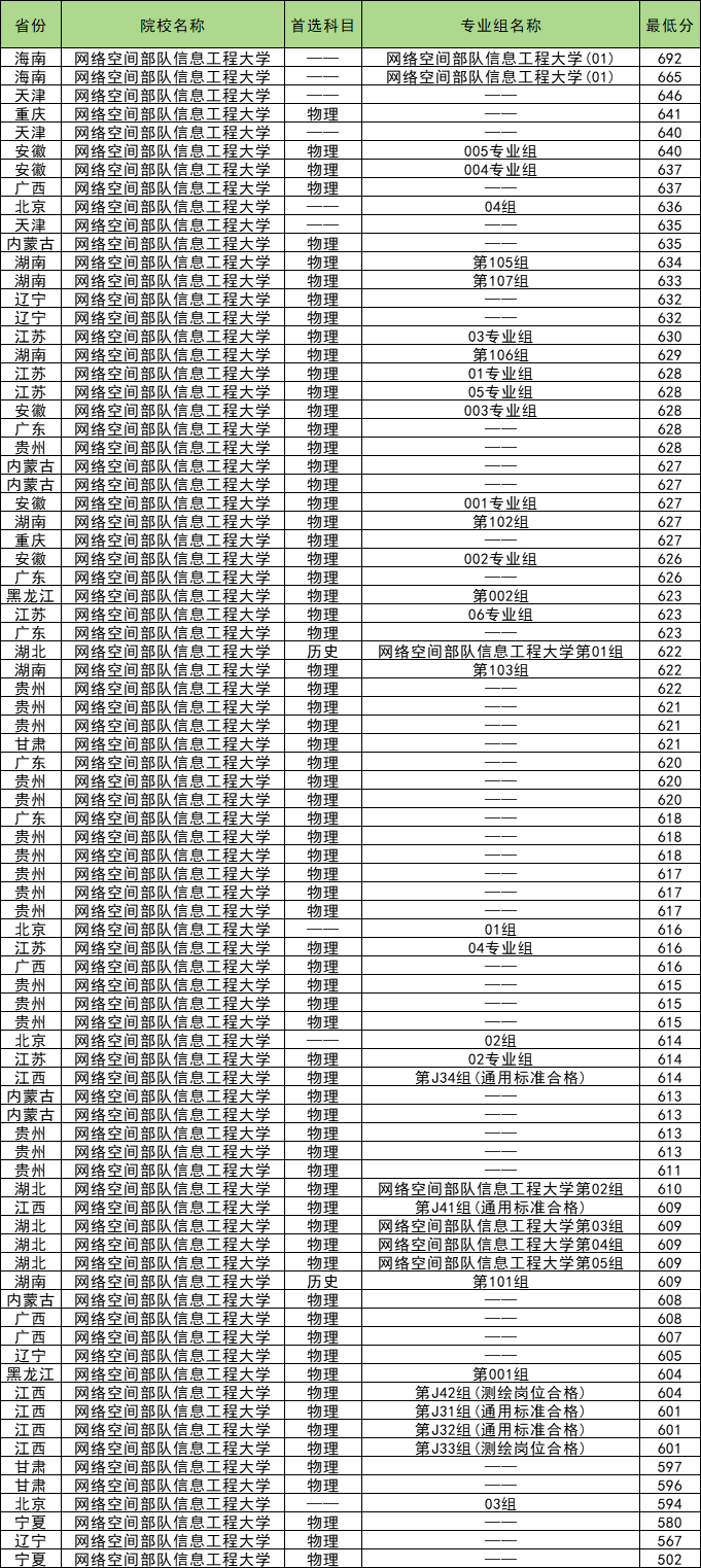 网络空间部队信息工程大学(原战略支援部队信息工程大学)2025年录取分数线位于502分至692分之间,各省最低分是:广西607分,黑龙江604分,天津635分,江西601分,重庆(男603分、女641分)等。