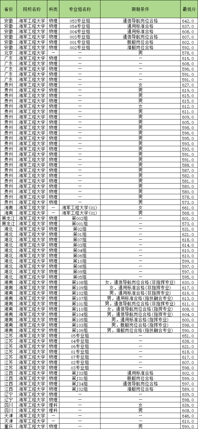 | 海军工程大学 | 物理 | 002专业组 | 潜艇岗位合格 | 600 |
