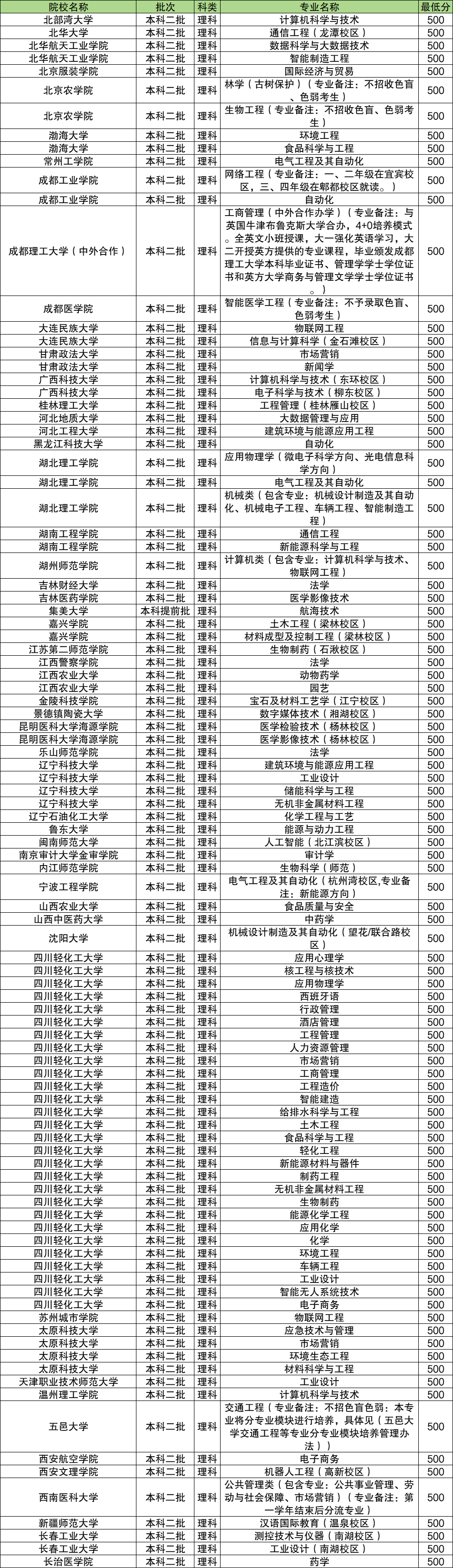 从全国大学四川省高考的分数来看,500分的理科考生能报考的专业,以及对应的学校如下表: