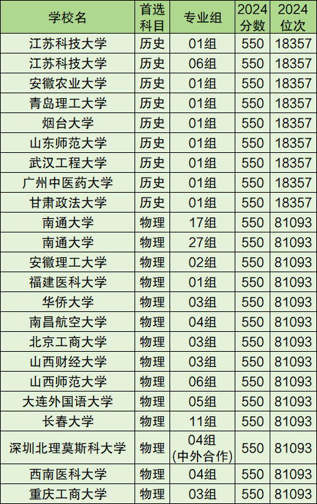 物理类550分对应能上的有14个院校专业组,包括省内的南通大学17组和27组、省外的福建医科大学01组和大连外国语大学05组等。