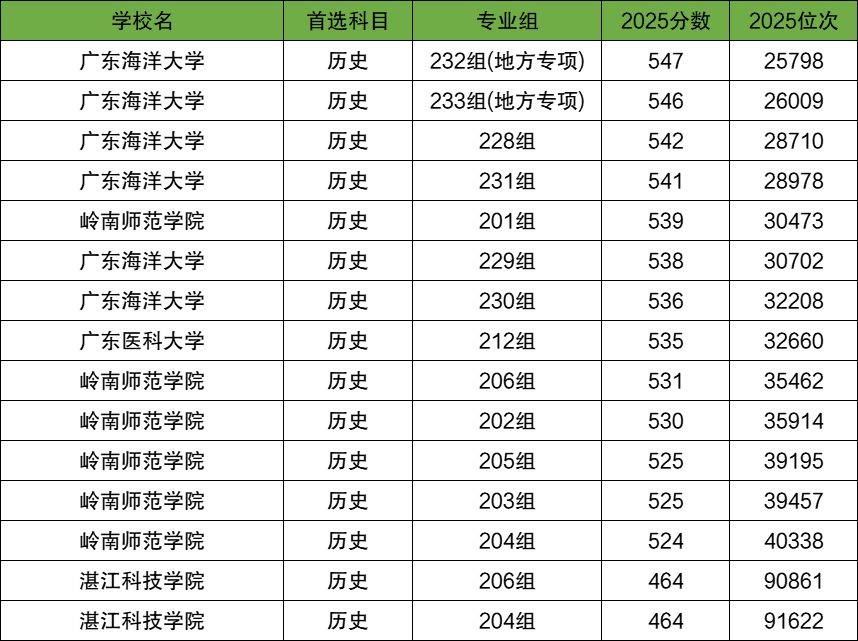 2025年湛江本科各大学中,在历史类分数线最高、最难考的院校是广东海洋大学232组(地方专项),2025年录取分数547分,录取位次25798位;