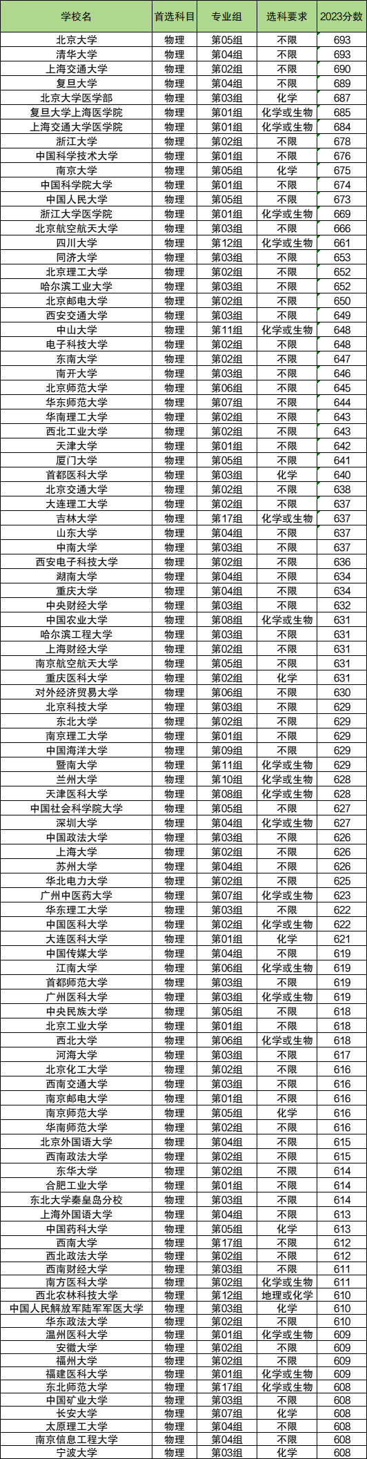 清华大学2023年全国排名第1名,在物化地考生共有3个专业组可报考,其中分数最低为688分,最高为693分。
