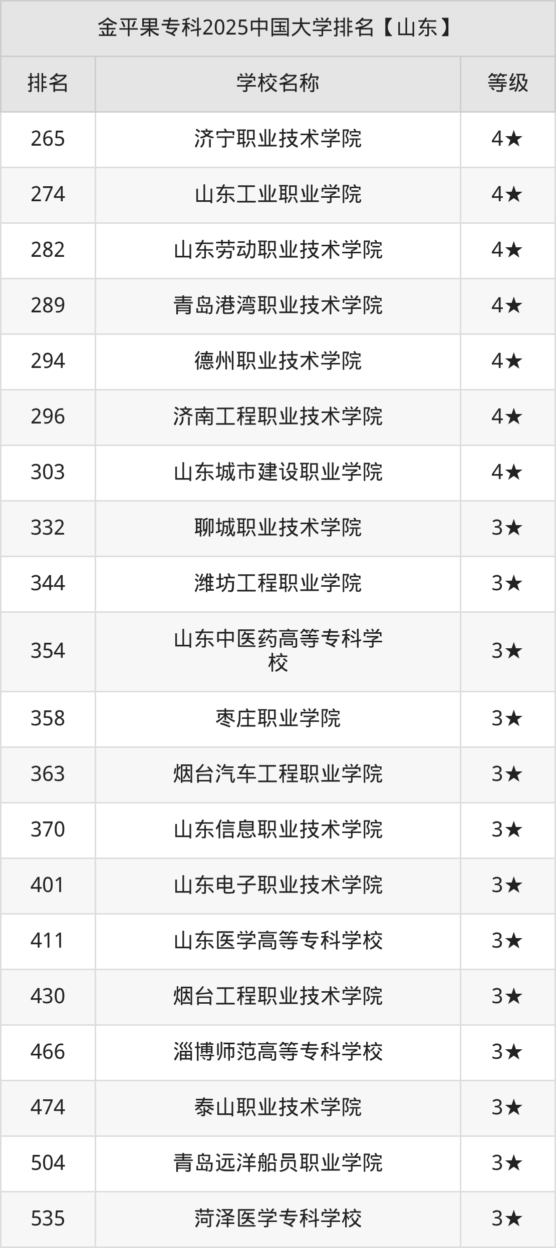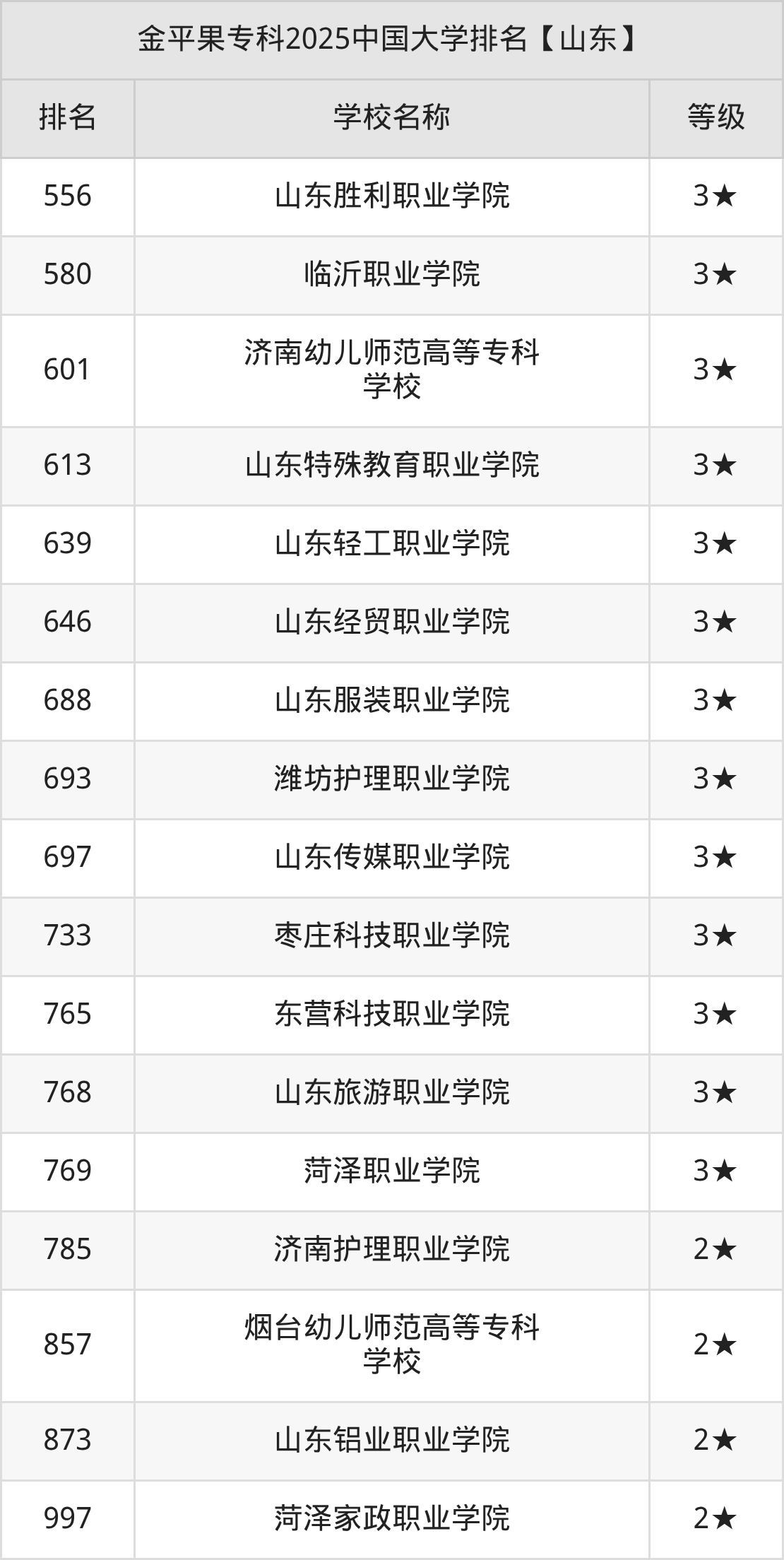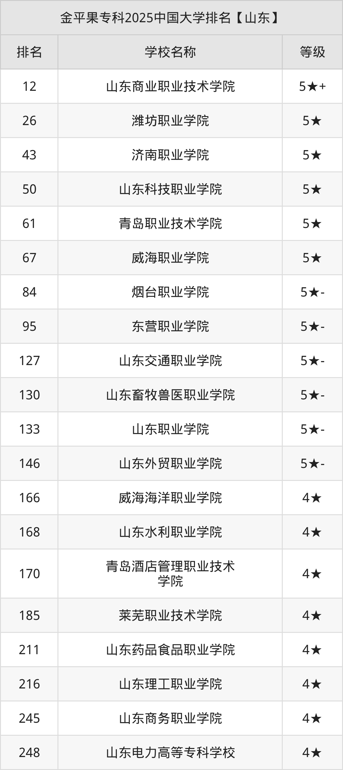 从2025金平果专科排名来看,山东省共计有57所公办专科学校上榜,其中排名前3的是山东商业职业技术学院、潍坊职业学院、济南职业学院。