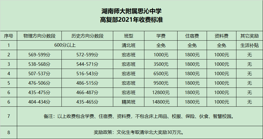 小编查询到湖南师大附属思沁中学高复部2021年收费标准情况,可以看出600分以上的考生可以进入学校的“清北班“,其学费、住宿费、资料费全部免收,还会进行生活补贴。如果首选物理考生高考成绩在569分到599分之间,首选历史考生高考成绩在572分到599分之间,那只用交1000元学费就行,加上住宿费和资料费,入学共缴纳3800元即可。