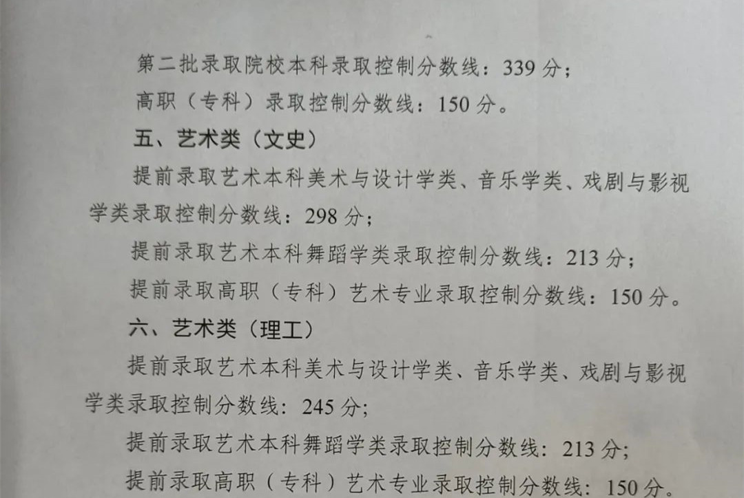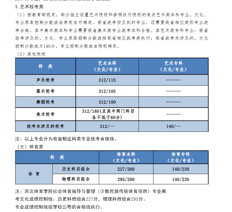 艺术类(本科)-音乐(声乐、器乐):物理类308分,历史类340分