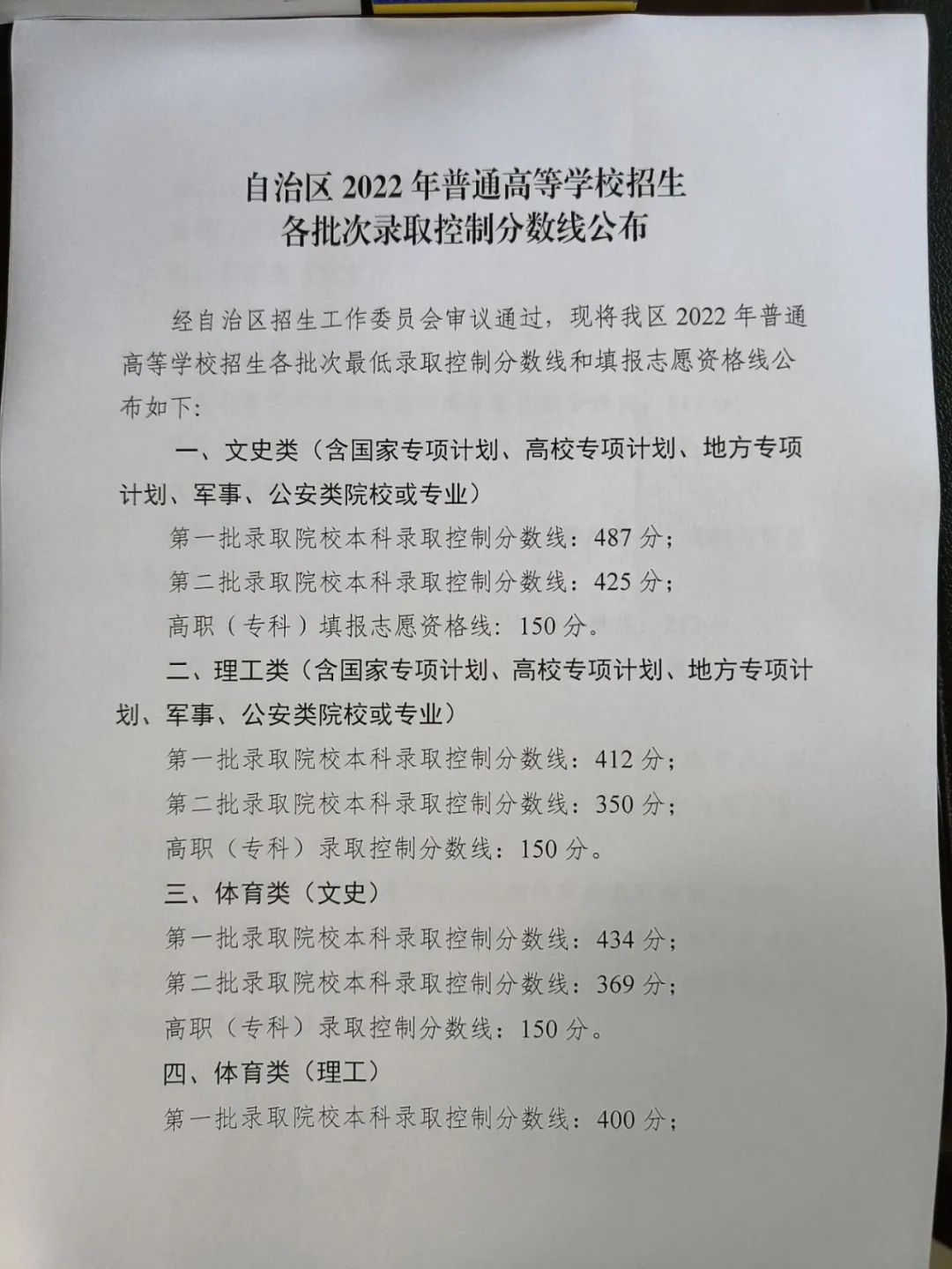 普通类一段437分,普通类二段150分