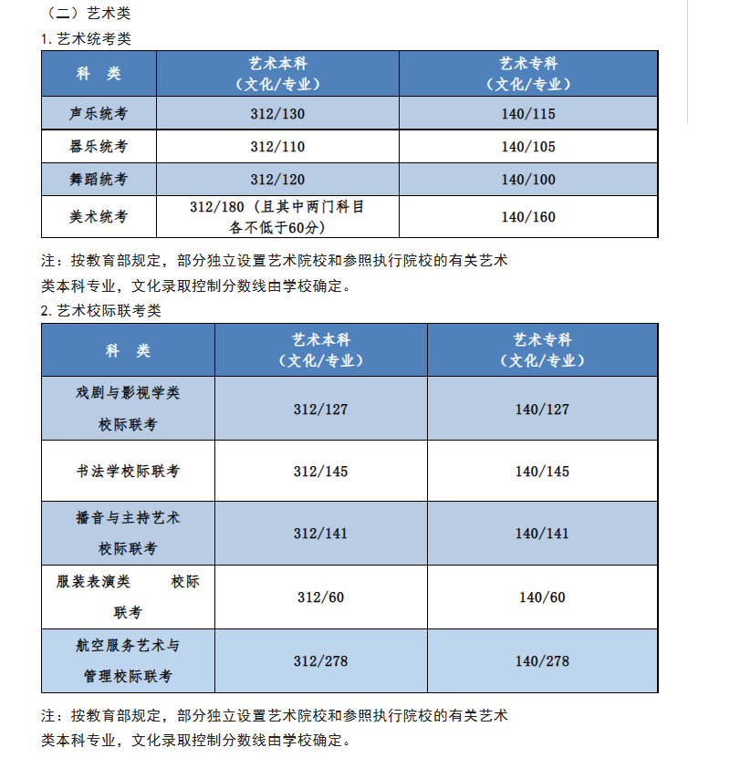 艺术类(本科):理科320分,文科380分