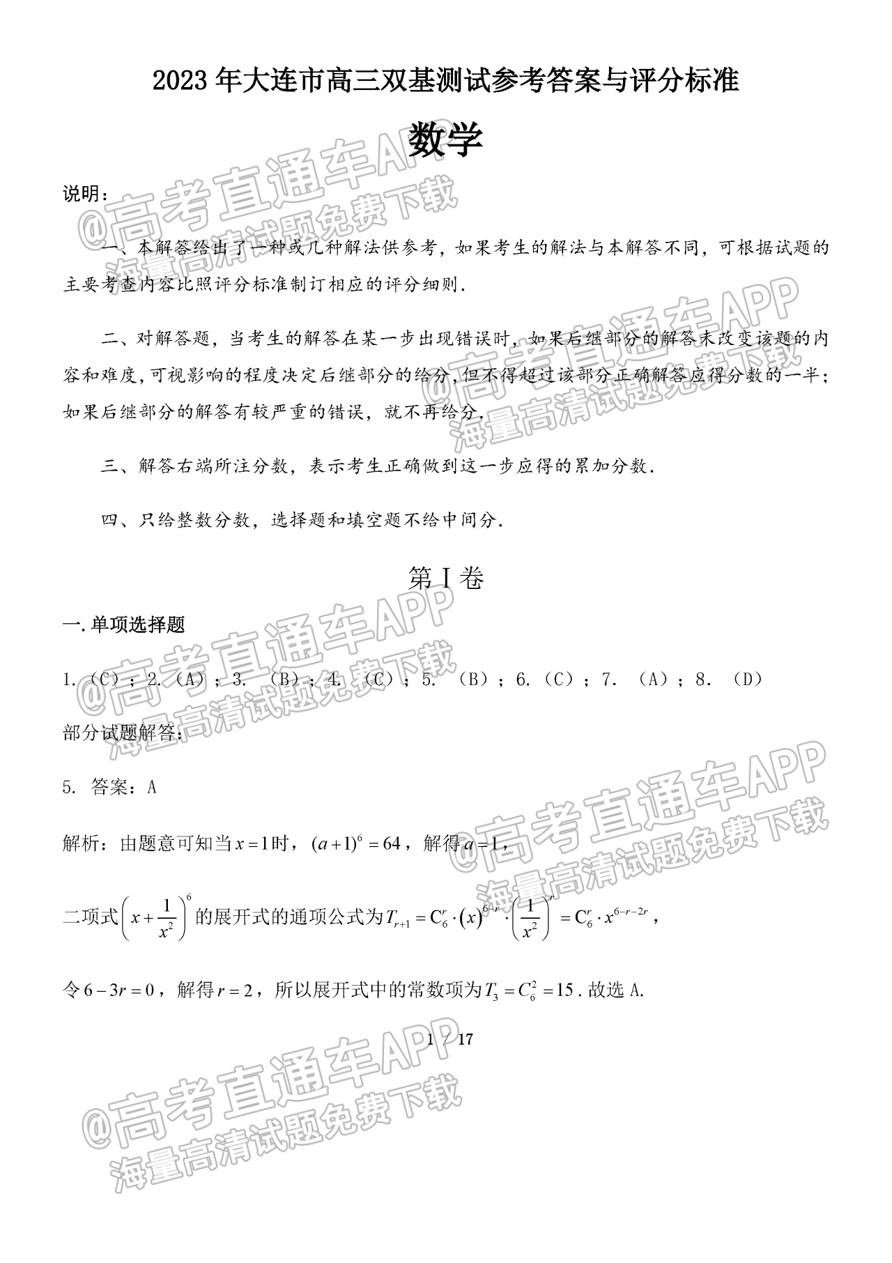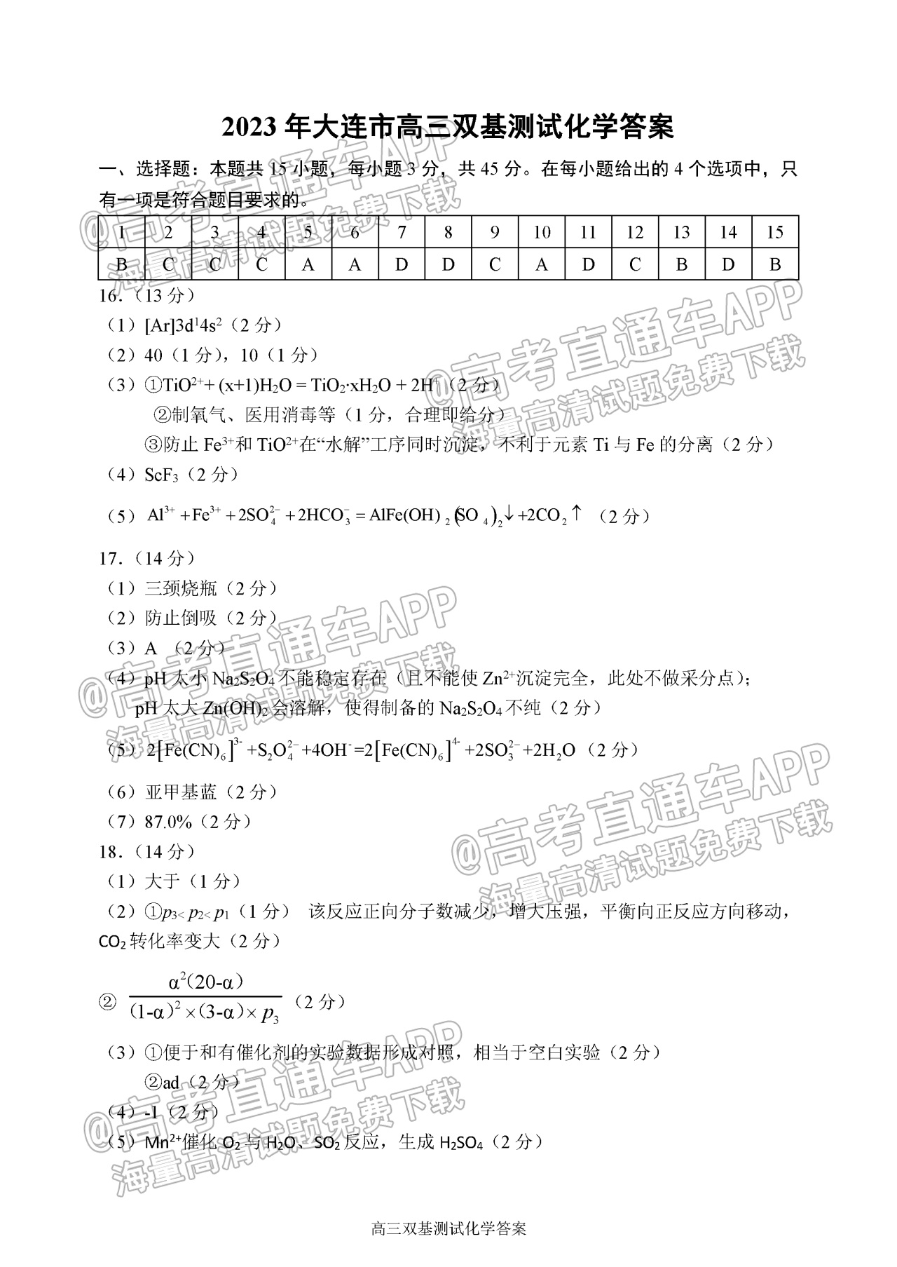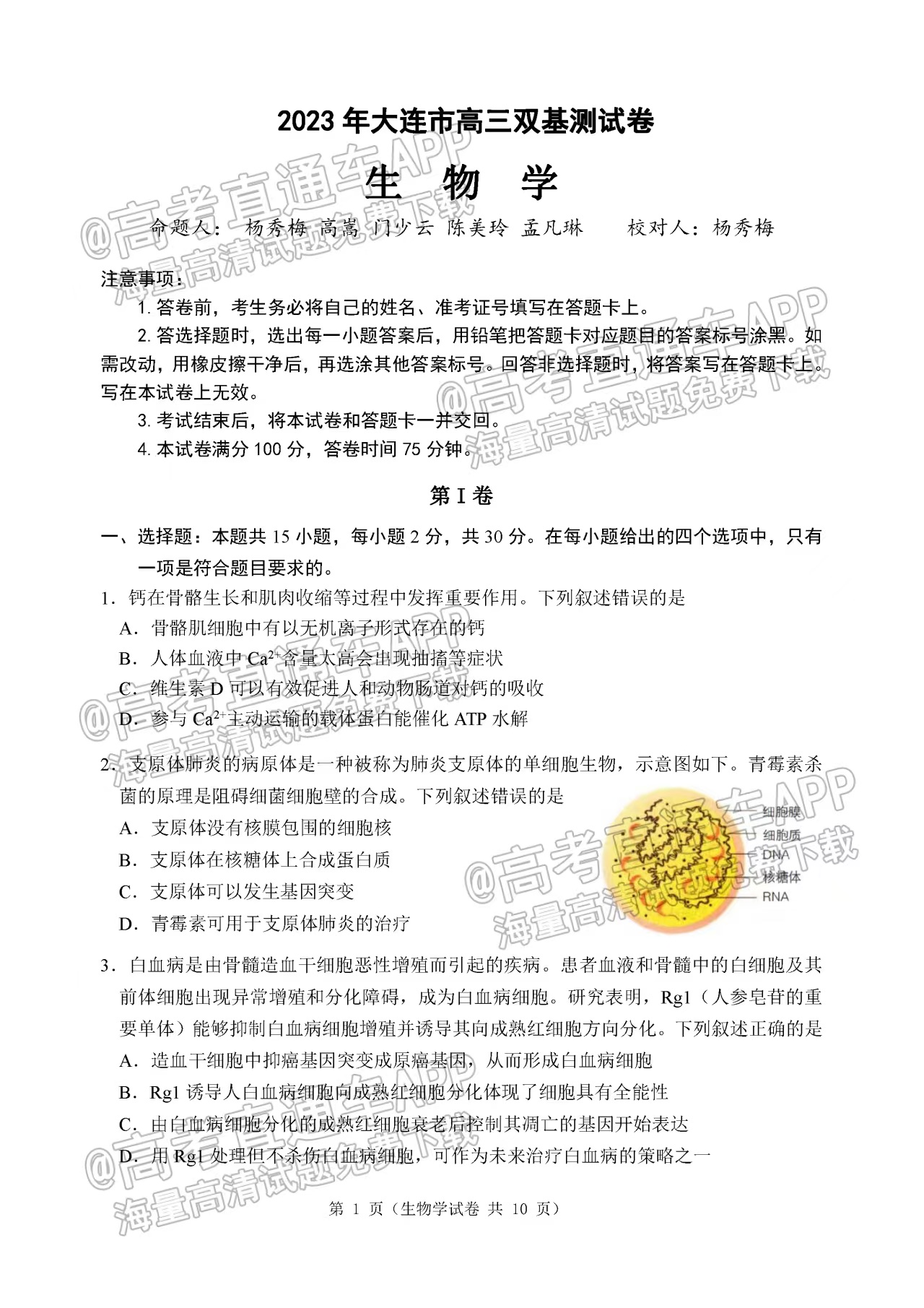 一.2023大连高三双基考试各科答案及试卷详情汇总