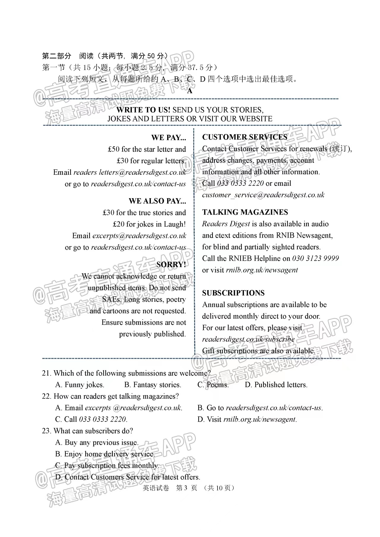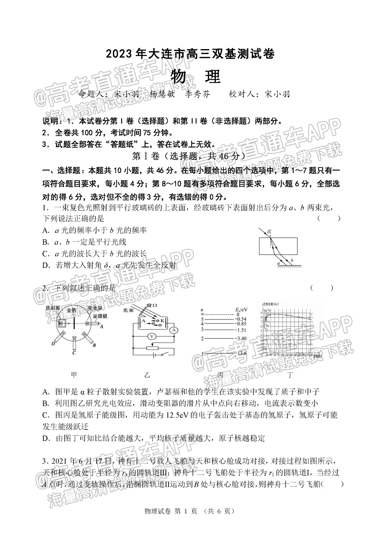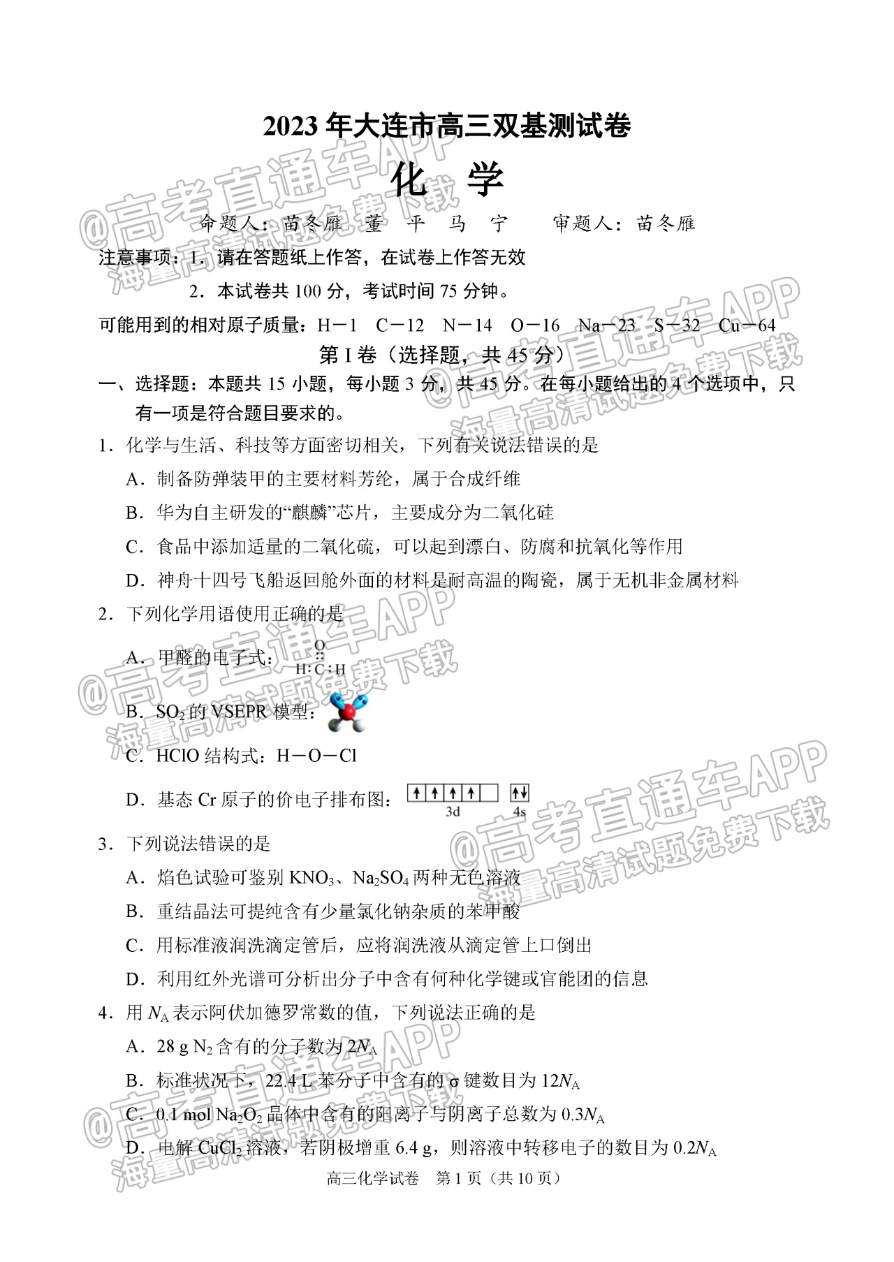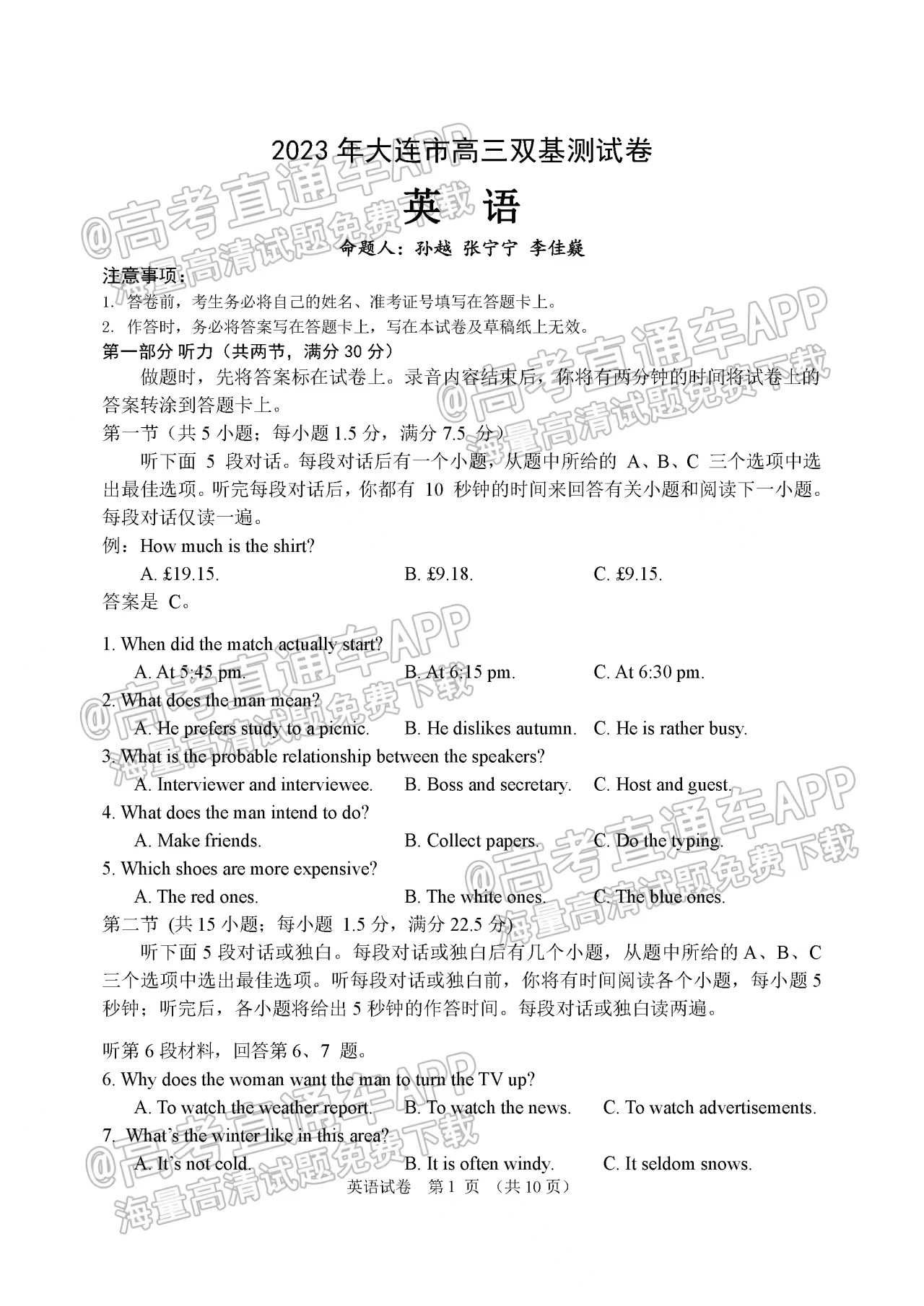 一.2023大连高三双基考试各科答案及试卷详情汇总