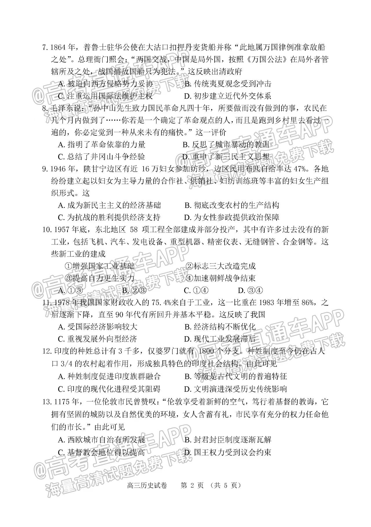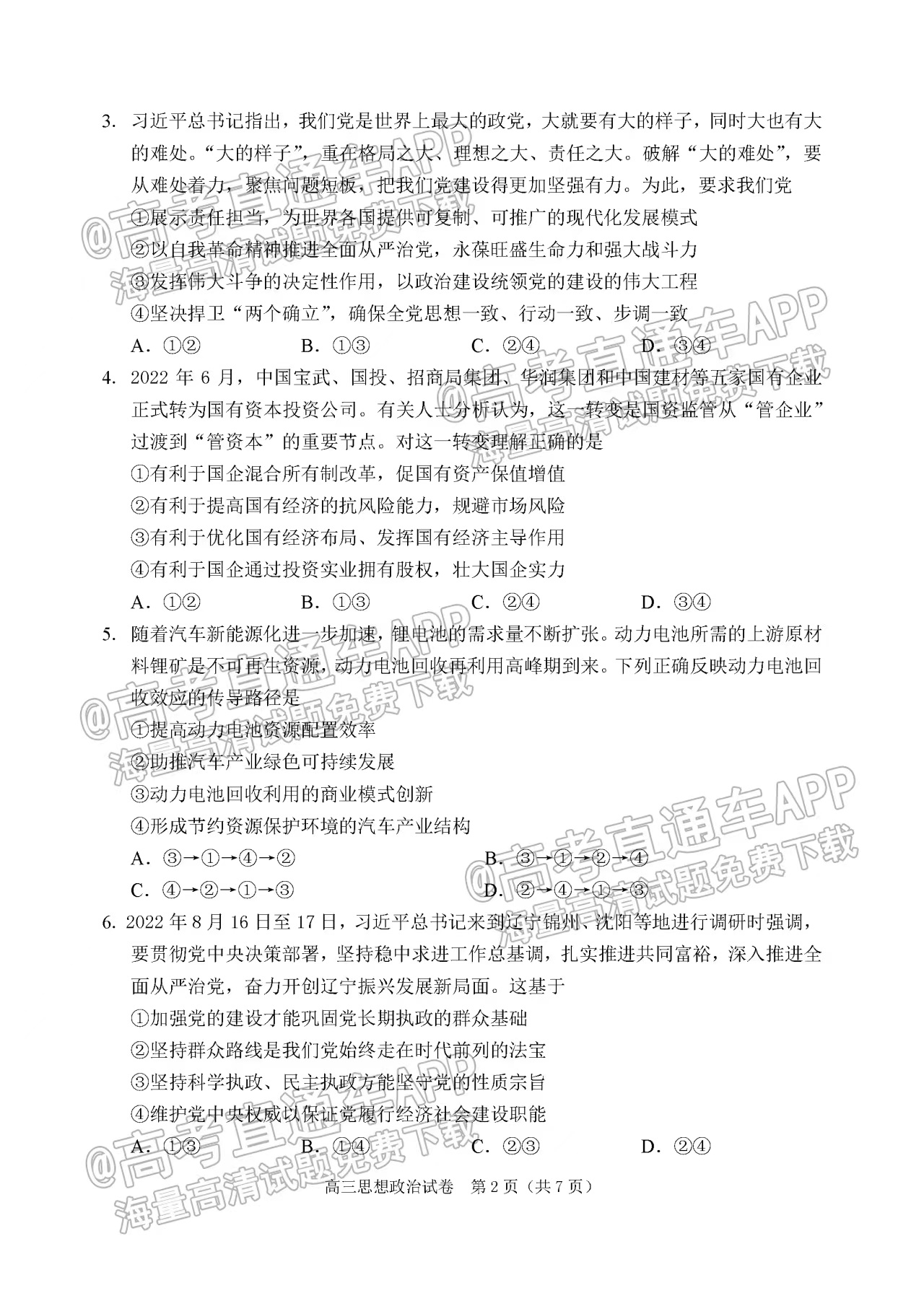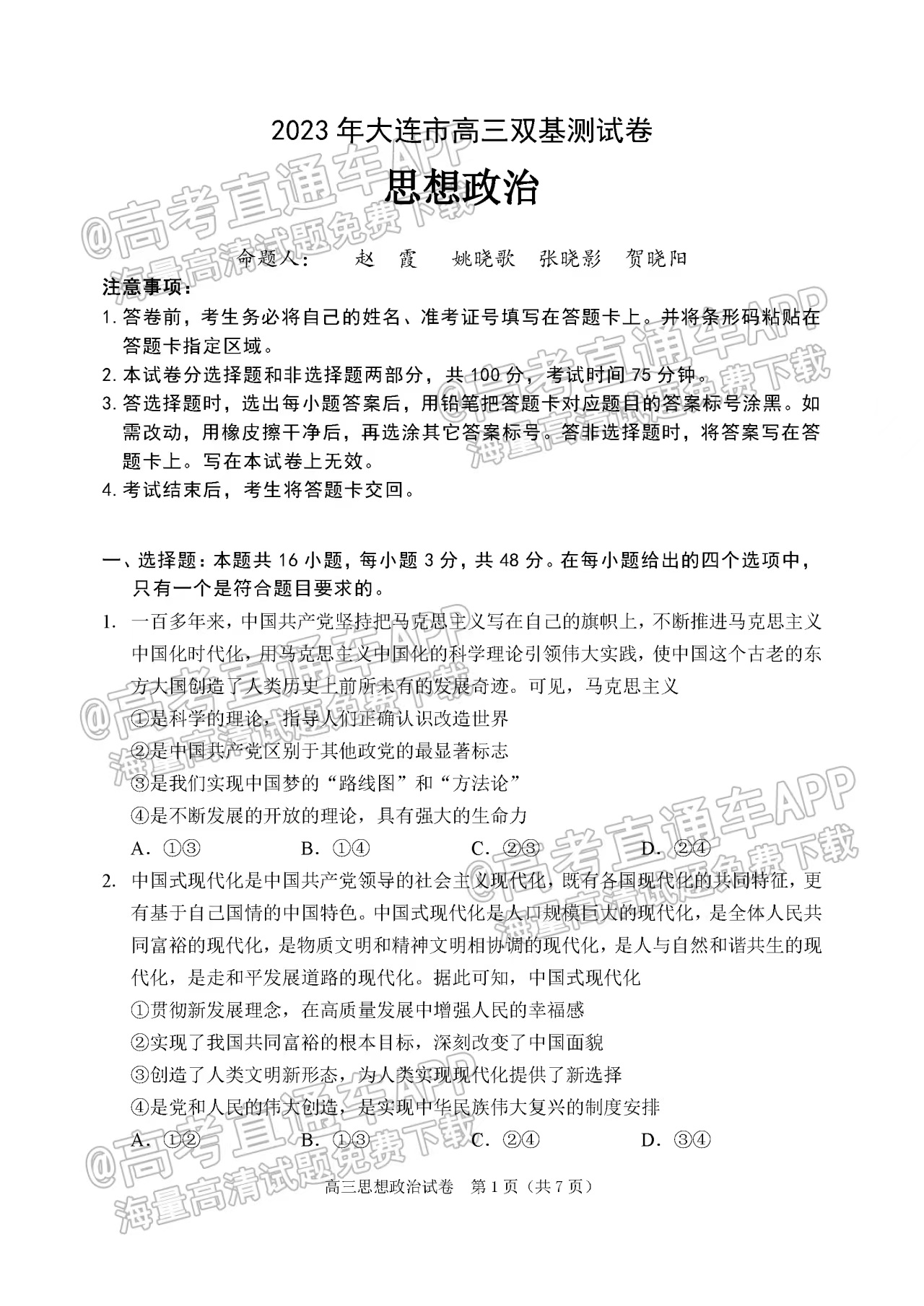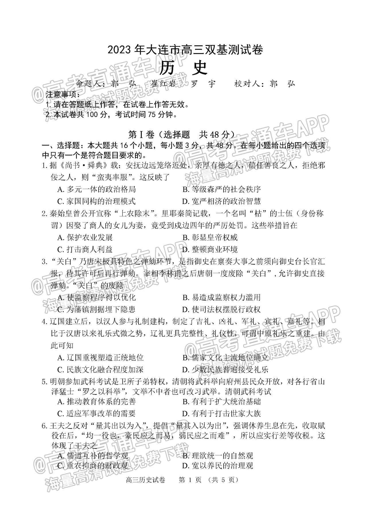 八、2023辽宁大连高三双基测试历史试卷及答案