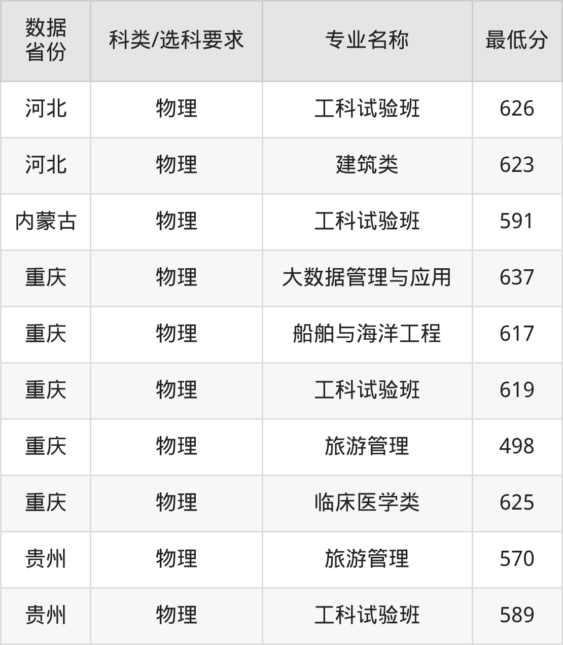 大数据管理与应用637分、船舶与海洋工程617分、工科试验班619分、旅游管理498分、临床医学类625分。