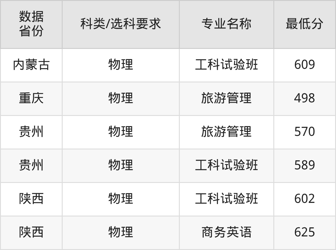 2025年华南理工大学高校专项计划在全国录取分数线是498分到625分之间,其中在广东最低分是601分、在内蒙古最低分是609分、在重庆最低分是498分。