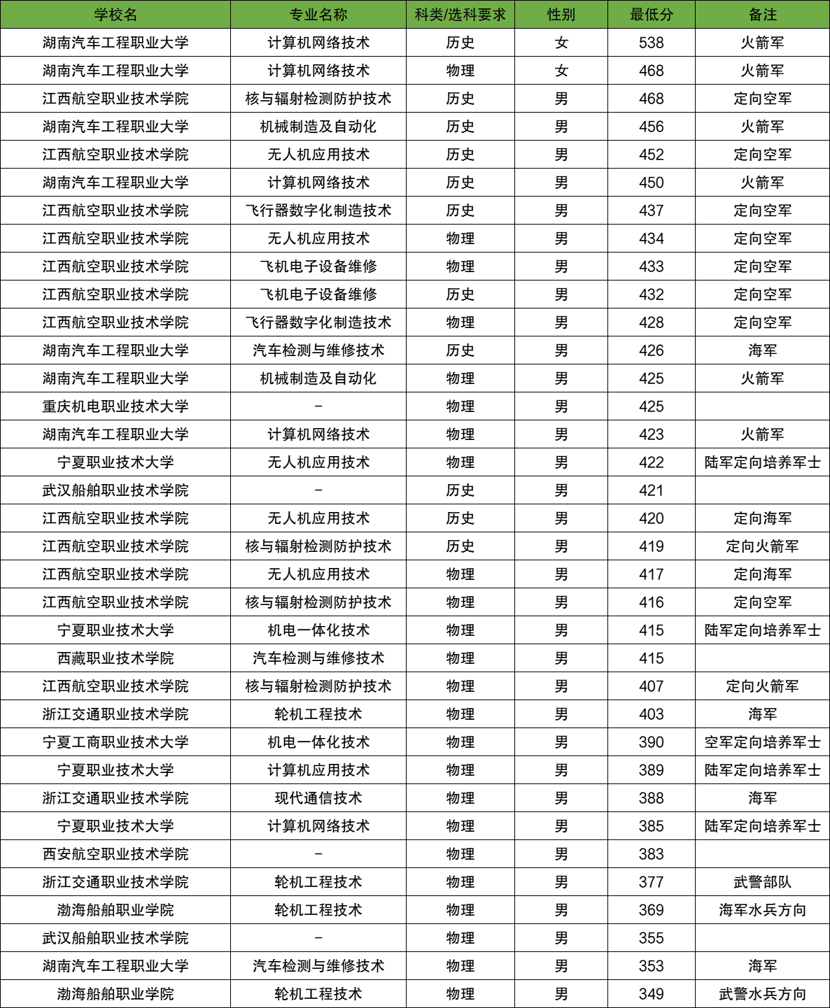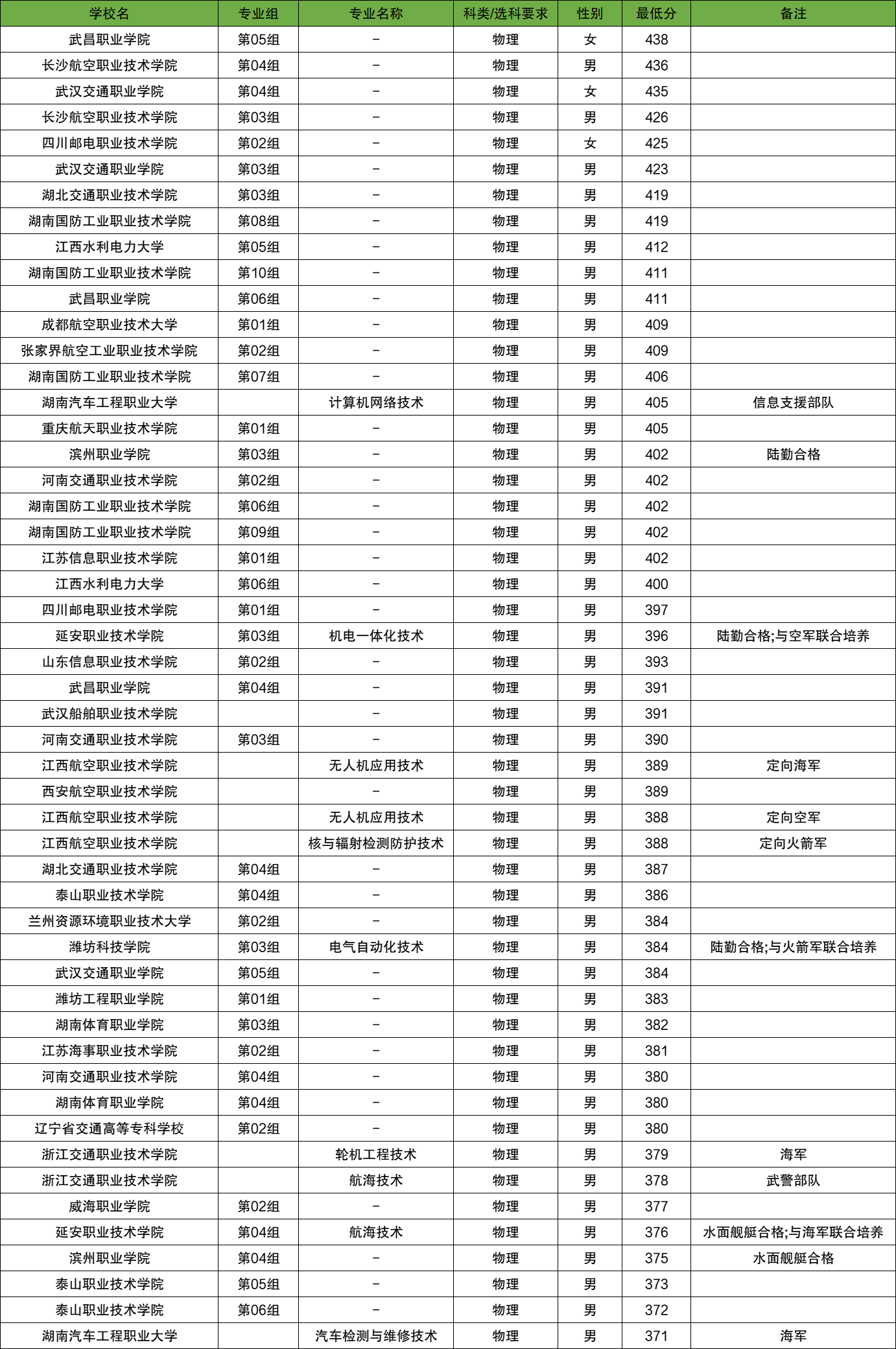 2025年在湖北物理科目组招收女生的军校只有3所院校3个专业组,收分高的是武昌职业学院第05组,2025年的最低录取分数线为438分;收分低的是四川邮电职业技术学院第02组,2025年的最低录取分数线为425分。