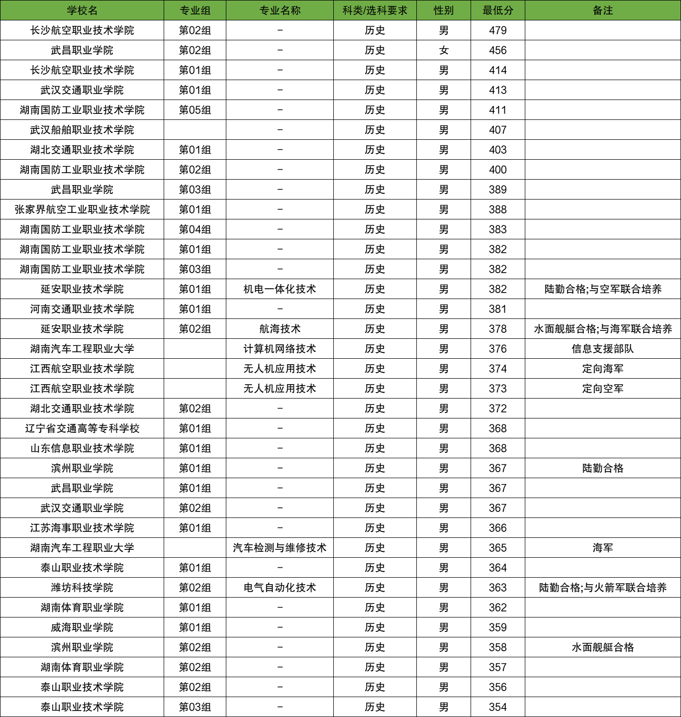 2025年在湖北历史科目组招收男生的士官学校一共有19所,涉及到35个专业组,其中收分最高的是长沙航空职业技术学院第02组,2025年的最低录取分数线为479分;收分最低的是泰山职业技术学院第03组,2025年的最低录取分数线为354分;
