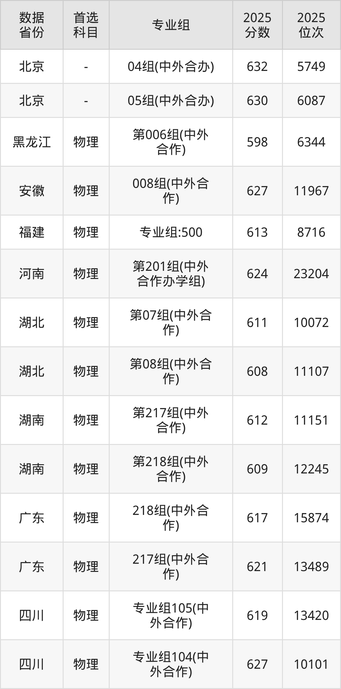 2025年华中科技大学中外合作办学在全国录取分数线是598分到632分之间,其中在湖北最低分是608分、在北京最低分是630分、在黑龙江最低分是598分。