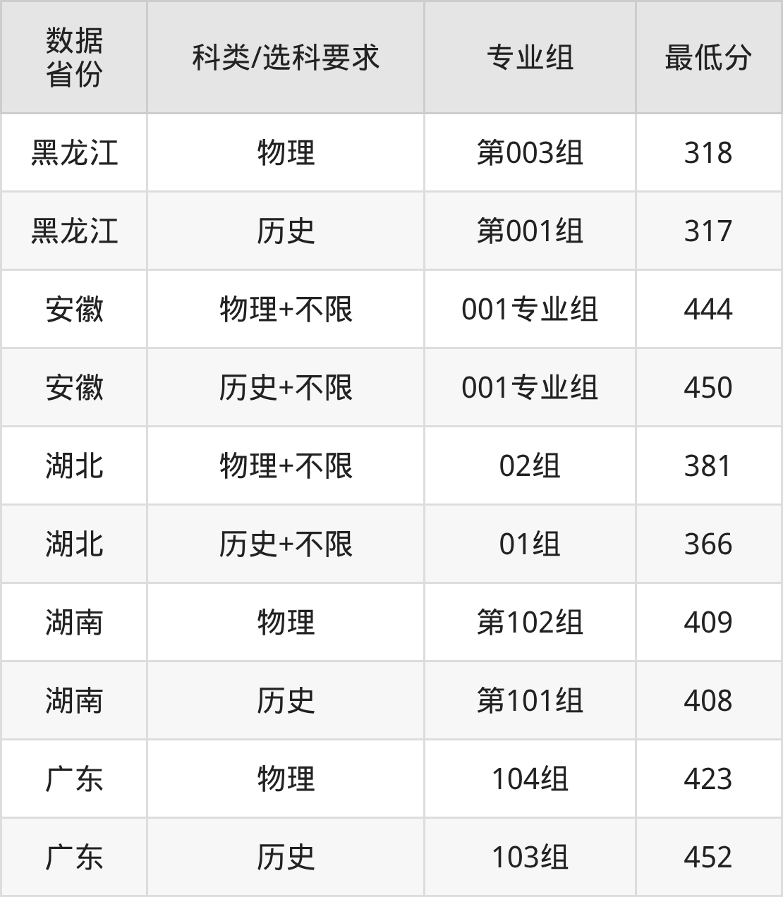(2)大学专业类地区:最低290分