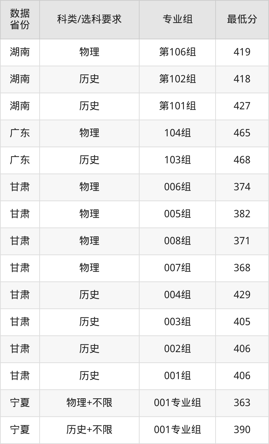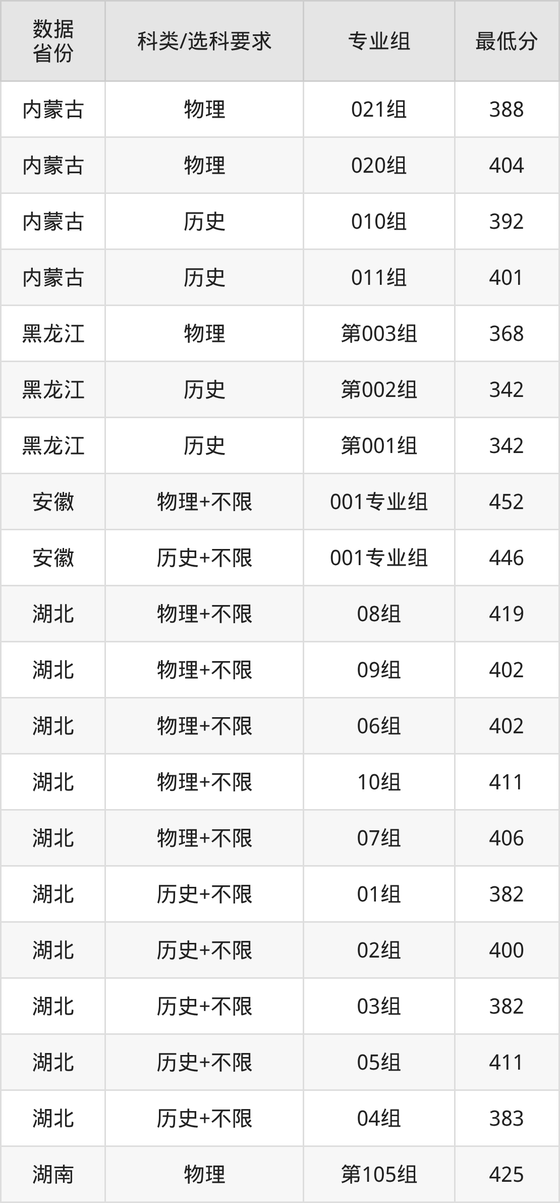(2)大学专业类地区:最低345分