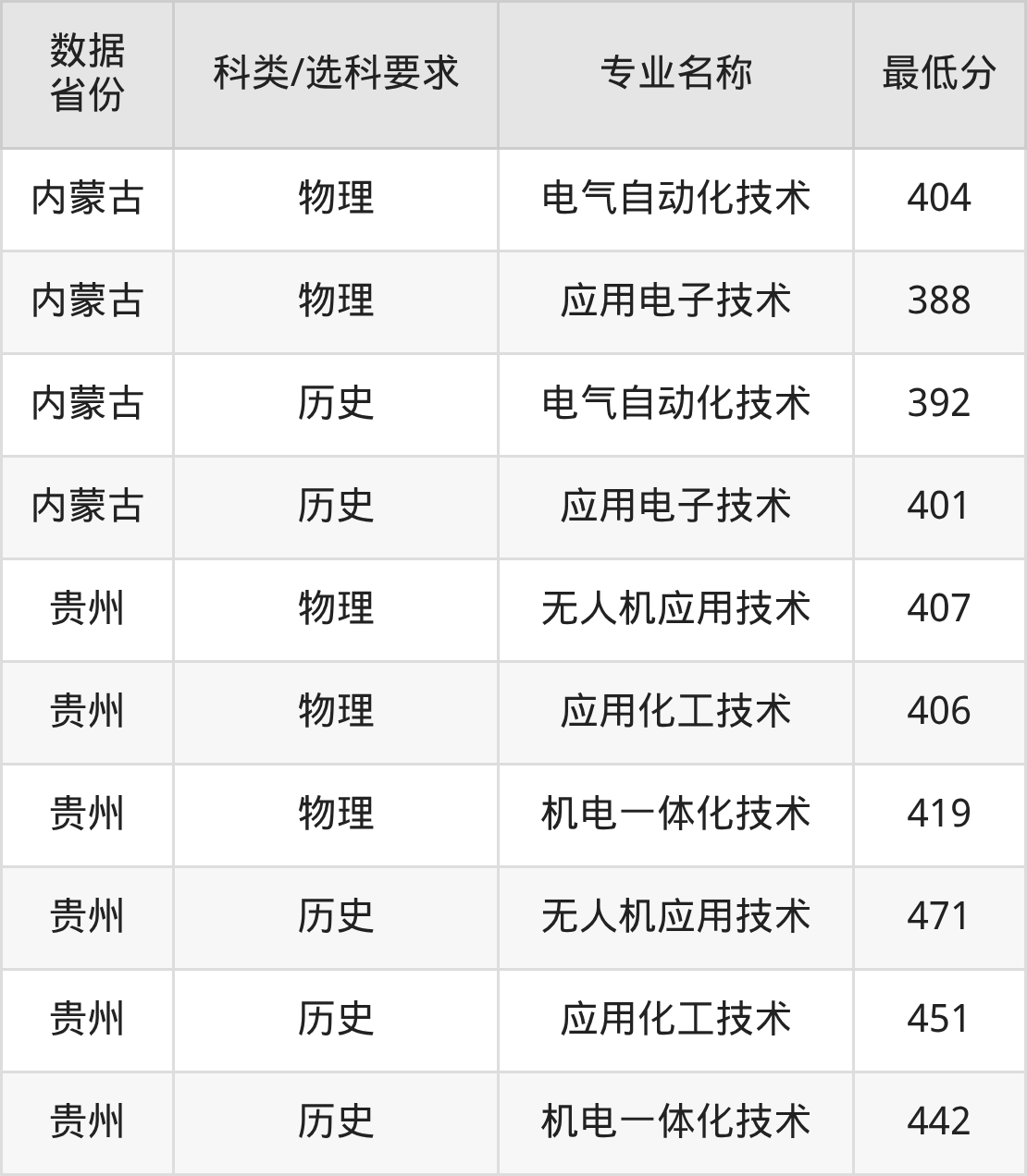 无人机应用技术(物理类407分、历史类471分)、应用化工技术(物理类406分、历史类451分)、机电一体化技术(物理类419分、历史类442分)。