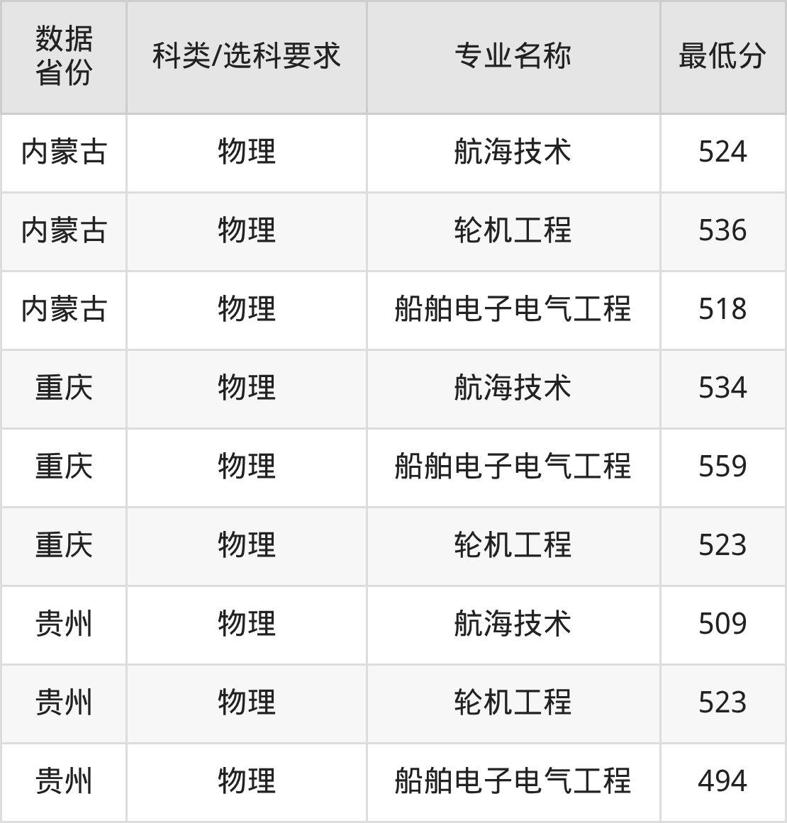 航海技术509分、轮机工程523分、船舶电子电气工程494分。