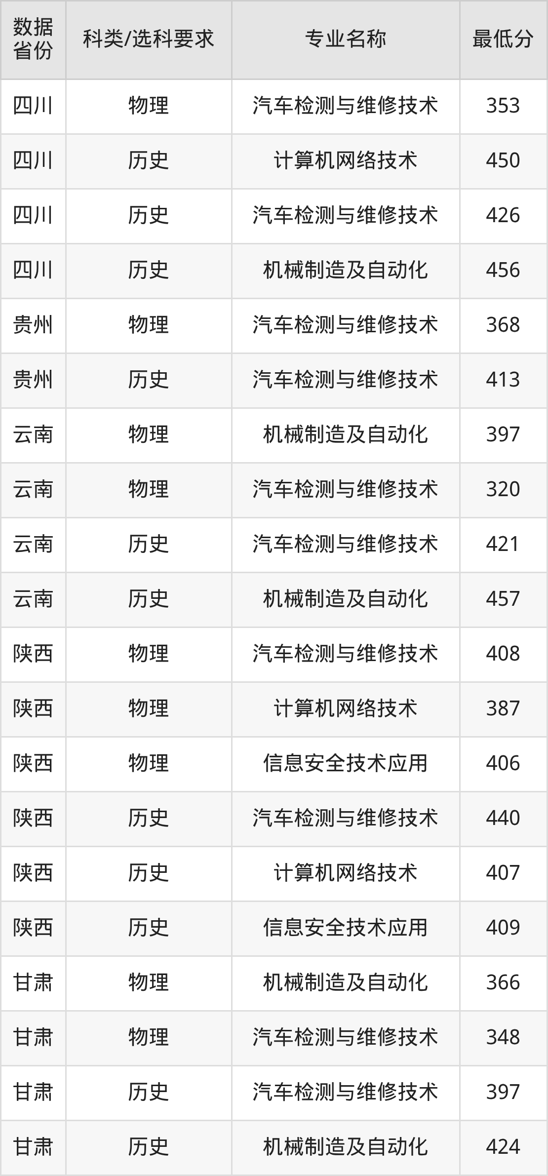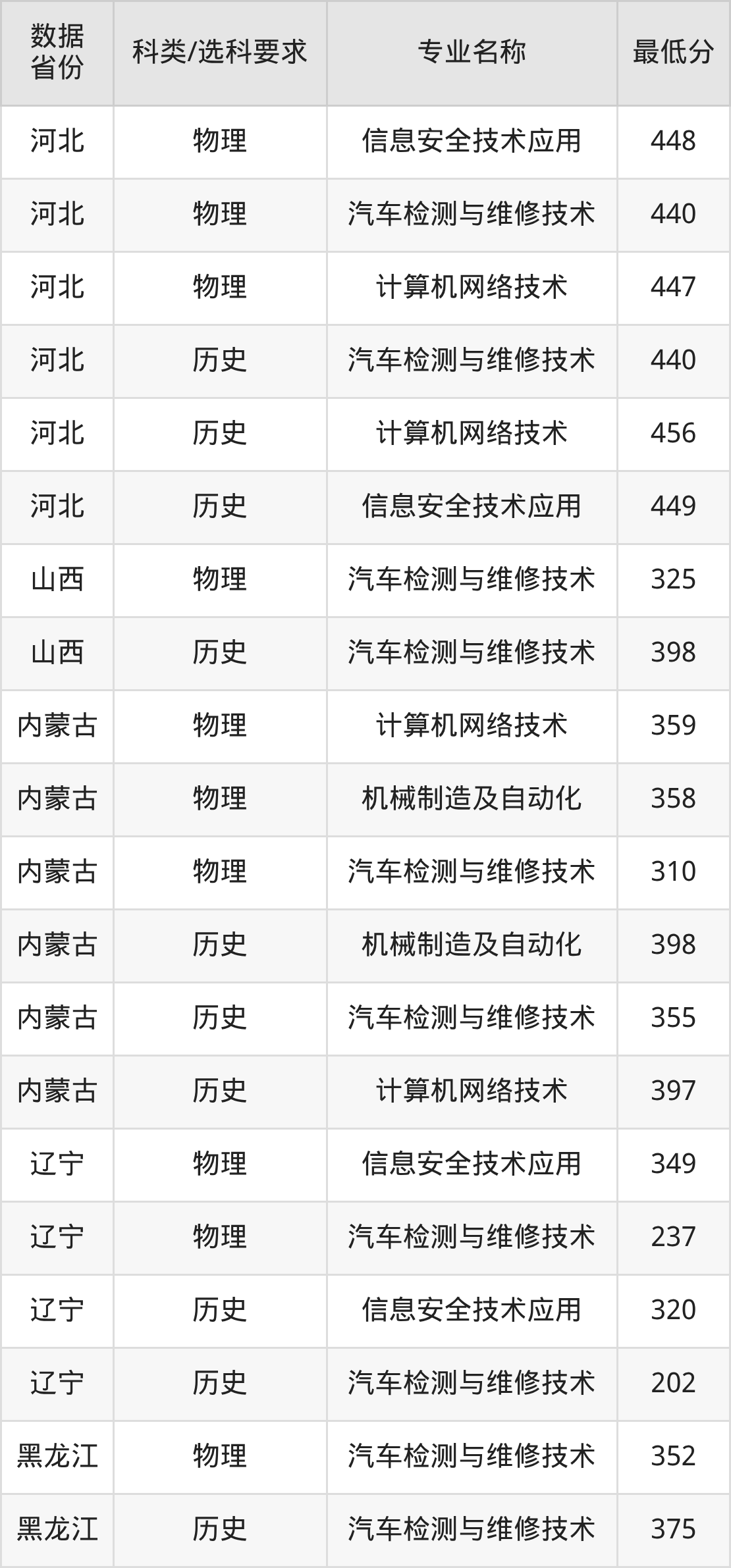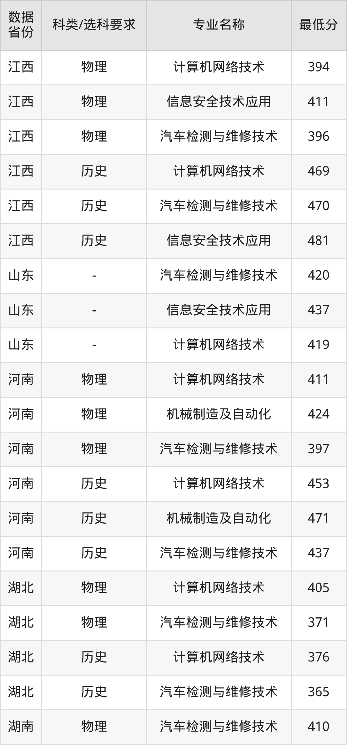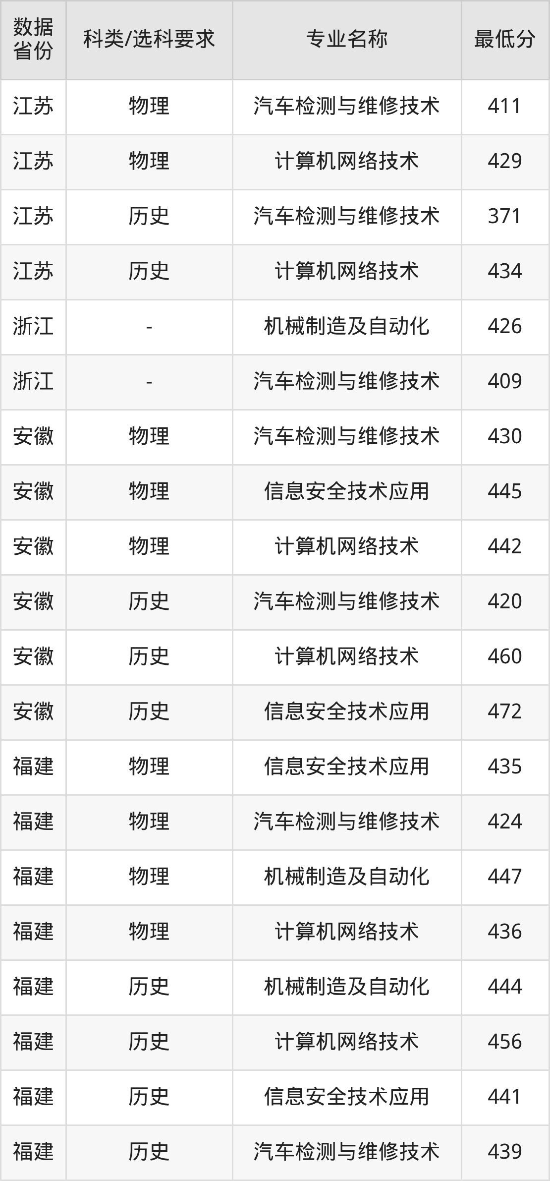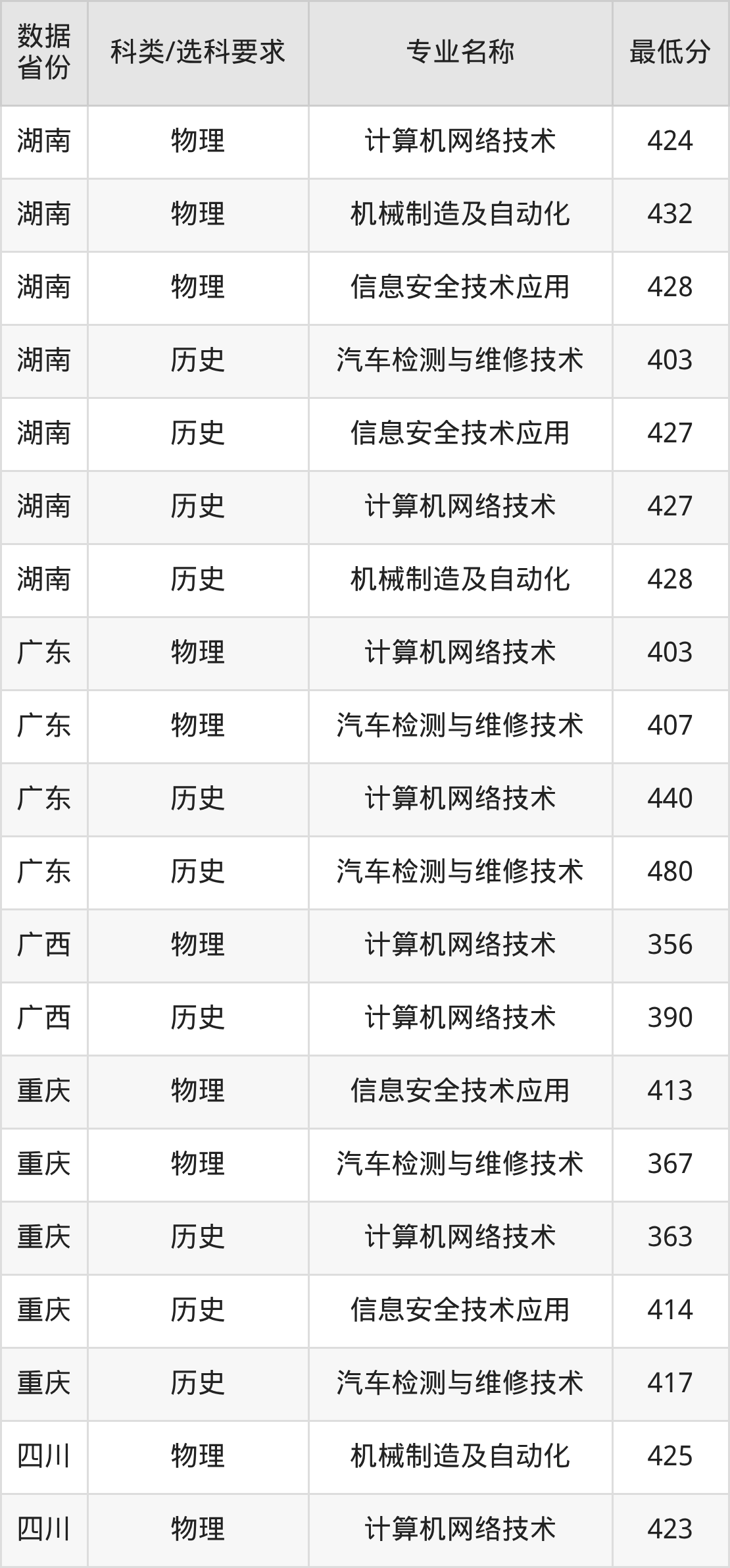 信息安全技术应用(物理类435分、历史类441分)、汽车检测与维修技术(物理类424分、历史类439分)、机械制造及自动化(物理类447分、历史类444分)、计算机网络技术(物理类436分、历史类456分)。