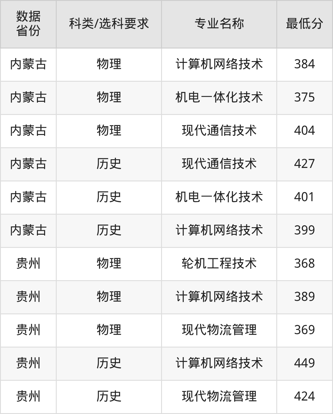 计算机网络技术(物理类384分、历史类399分)、机电一体化技术(物理类375分、历史类401分)、现代通信技术(物理类404分、历史类427分)。