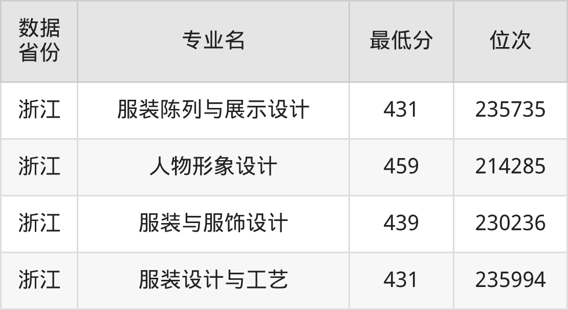服装陈列与展示设计431分、人物形象设计459分、服装与服饰设计439分、服装设计与工艺431分。
