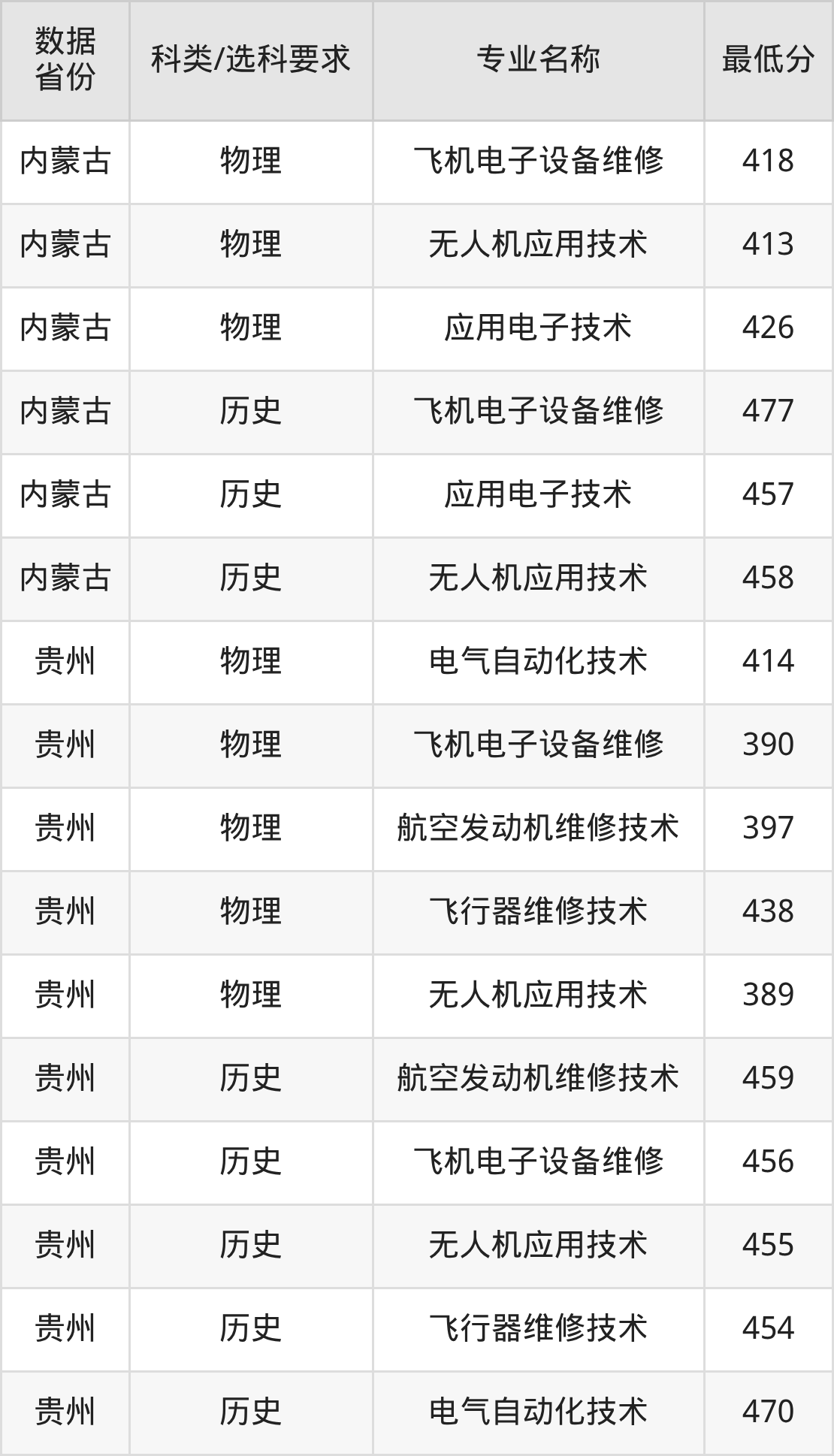 电气自动化技术(物理类414分、历史类470分)、飞机电子设备维修(物理类390分、历史类456分)、航空发动机维修技术(物理类397分、历史类459分)、飞行器维修技术(物理类438分、历史类454分)、无人机应用技术(物理类389分、历史类455分)。