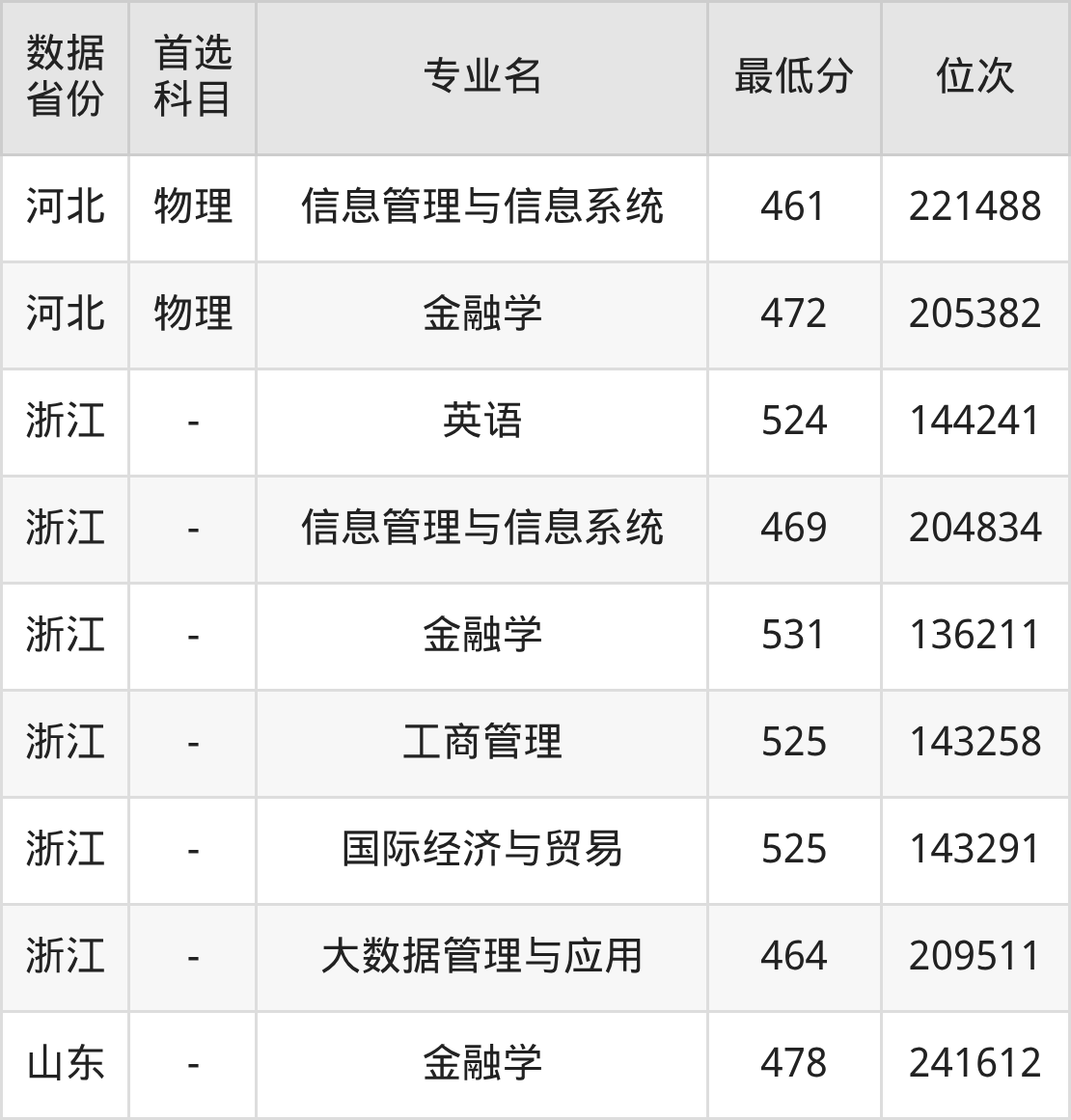 英语524分、信息管理与信息系统469分、金融学531分、工商管理525分、国际经济与贸易525分、大数据管理与应用464分。