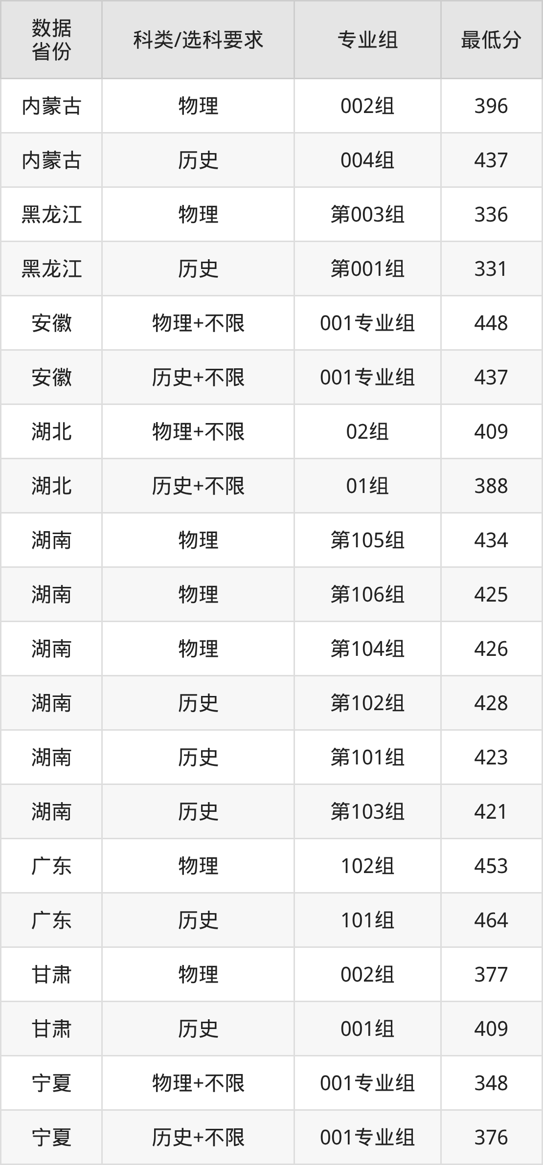(2)大学专业类地区:最低363分