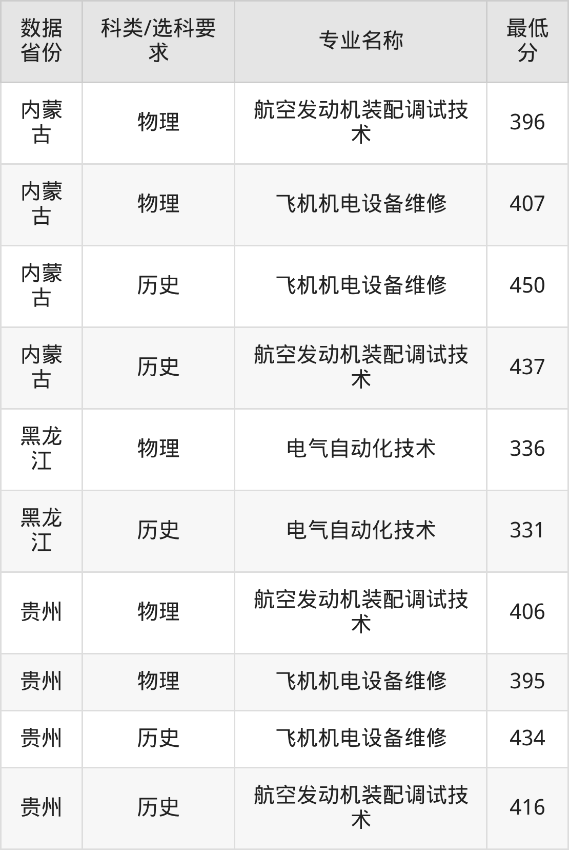 航空发动机装配调试技术(物理类396分、历史类437分)、飞机机电设备维修(物理类407分、历史类450分)。