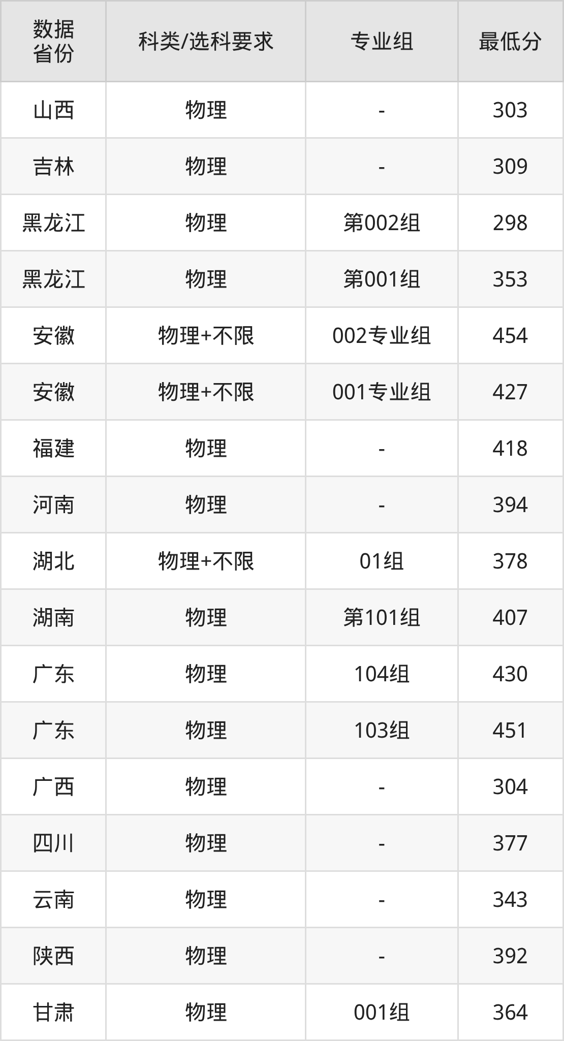 (1)院校专业组地区:最低298分