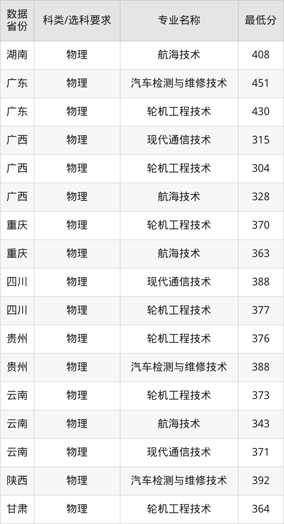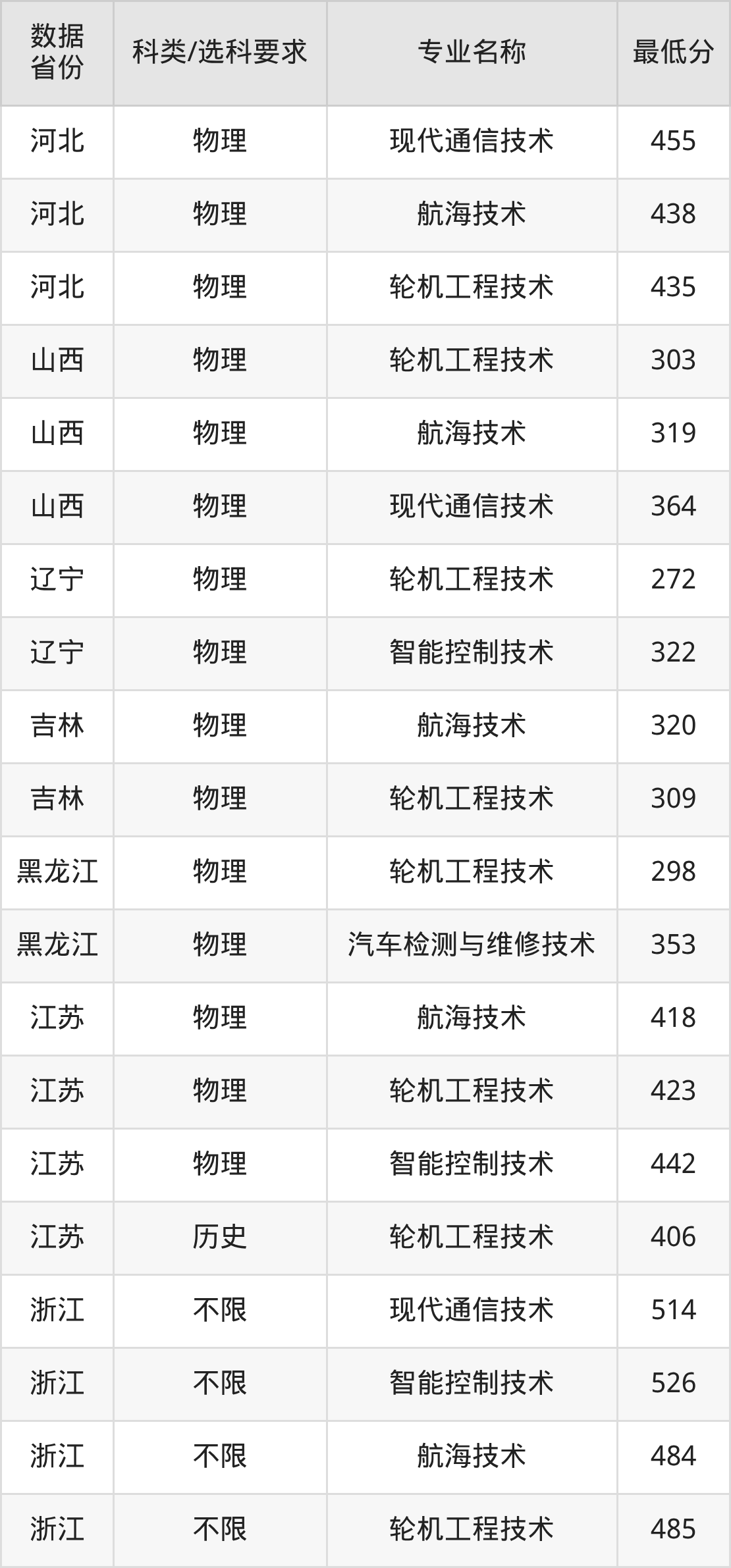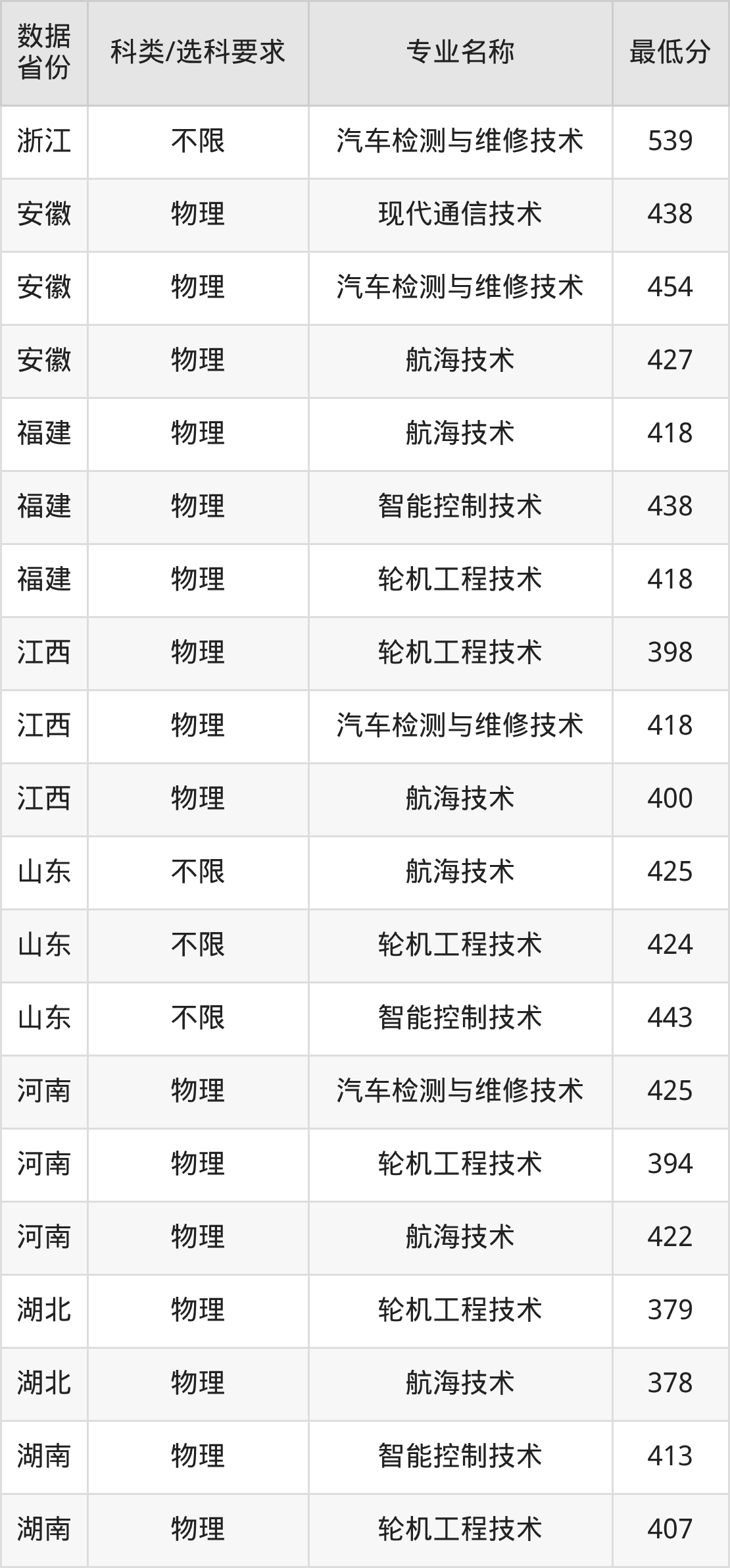 现代通信技术514分、智能控制技术526分、航海技术484分、轮机工程技术485分、汽车检测与维修技术539分。