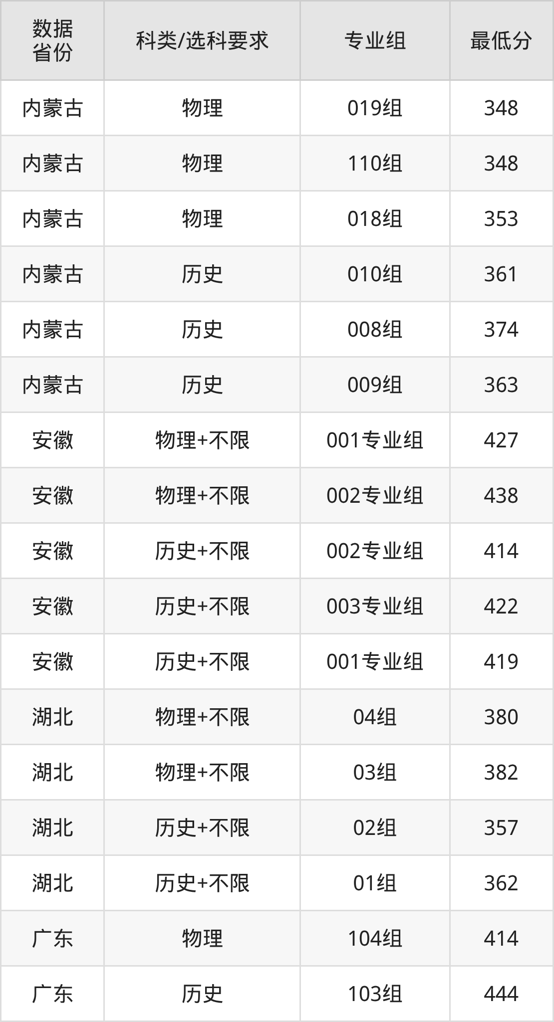 (2)大学专业类地区:最低337分