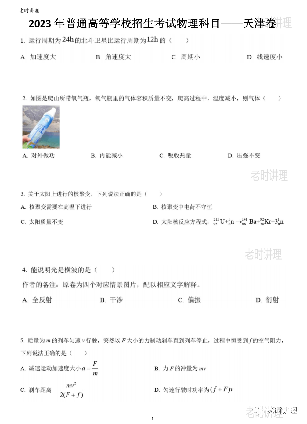 一、2023年天津高考物理试卷真题