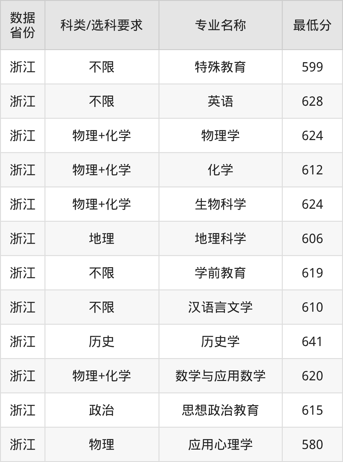 特殊教育599分、英语628分、物理学624分、化学612分、生物科学624分、地理科学606分、学前教育619分、汉语言文学610分、历史学641分、数学与应用数学620分。