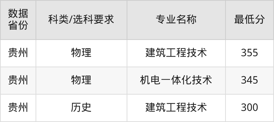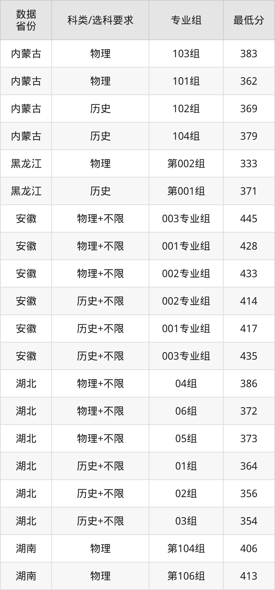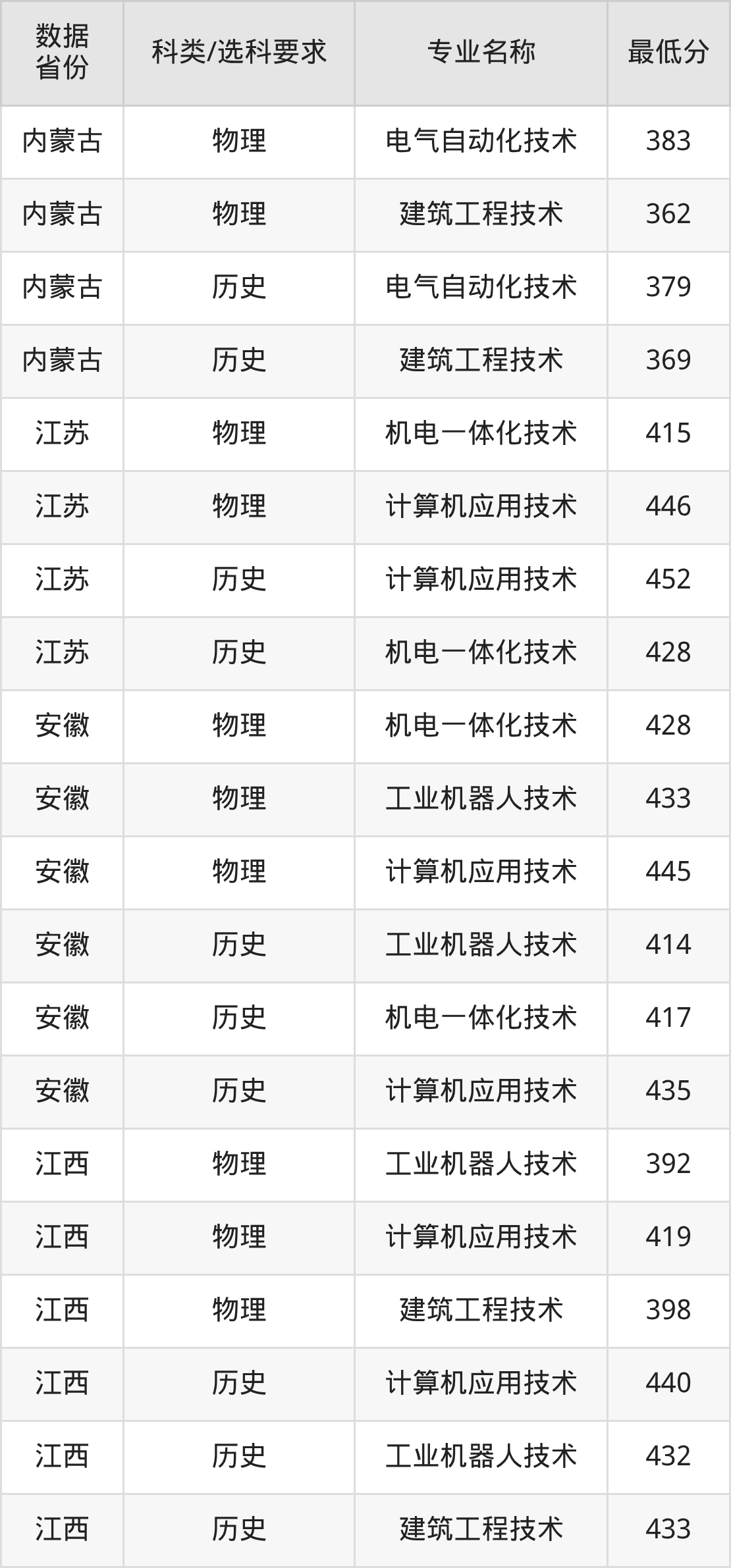 机电一体化技术(物理类428分、历史类417分)、工业机器人技术(物理类433分、历史类414分)、计算机应用技术(物理类445分、历史类435分)。
