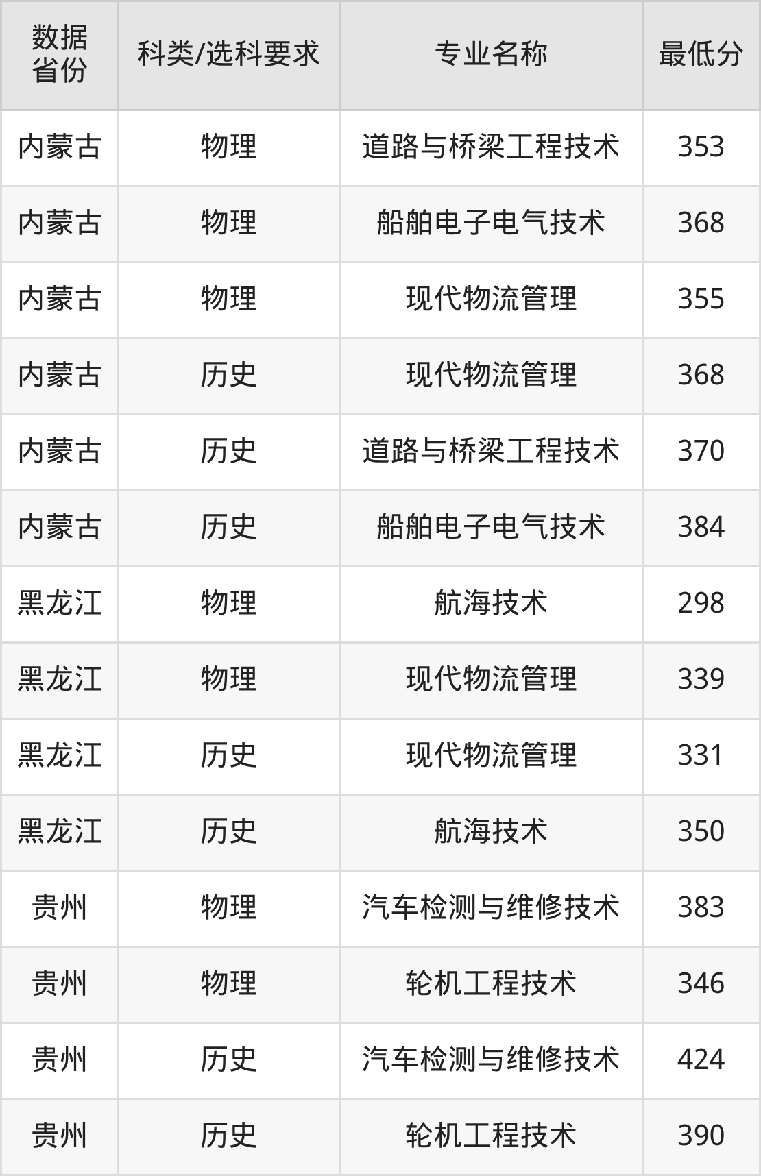 道路与桥梁工程技术(物理类353分、历史类370分)、船舶电子电气技术(物理类368分、历史类384分)、现代物流管理(物理类355分、历史类368分)。