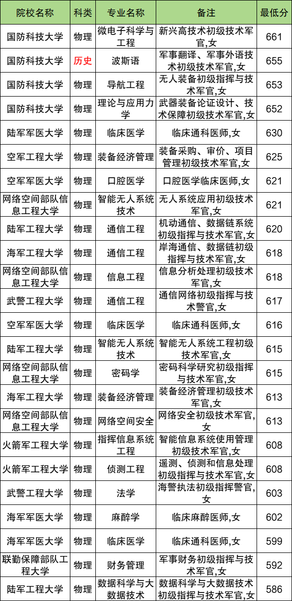 招女生的军校有国防科技大学、海军工程大学、火箭军工程大学、联勤保障部队工程大学等,招生专业包括指挥信息系统工程、侦测工程、装备经济管理、口腔医学、临床医学等。下面是各个军校在女生中的录取分数线汇总: