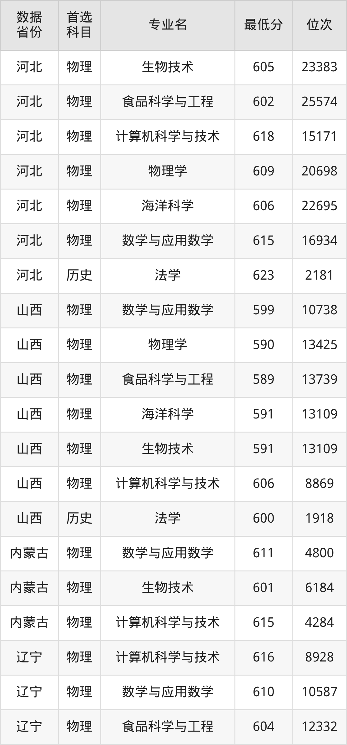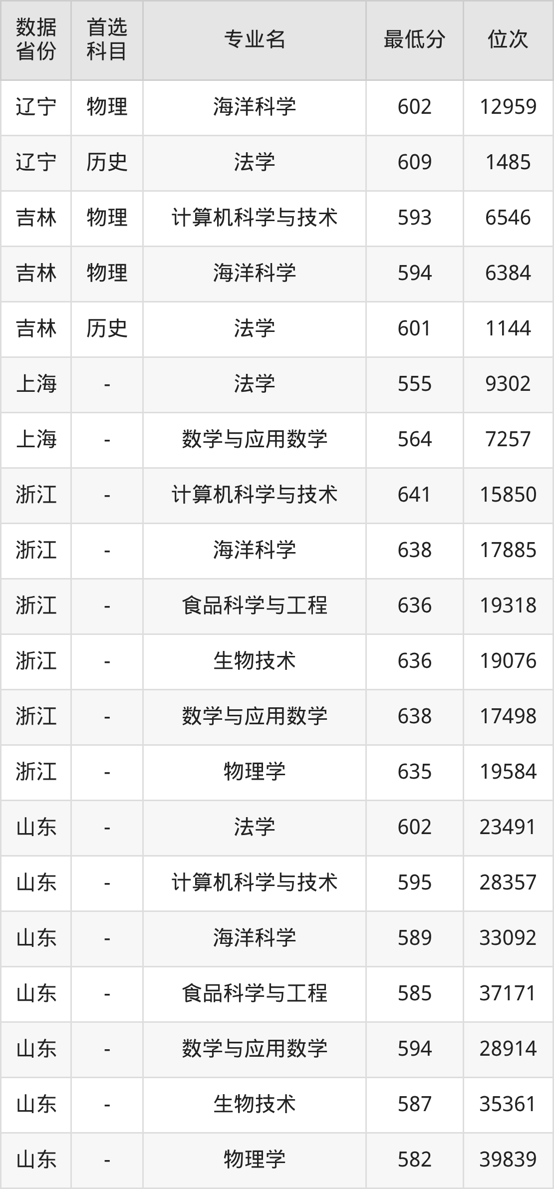 数学与应用数学(物理类599分)、物理学(物理类590分)、食品科学与工程(物理类589分)、海洋科学(物理类591分)、生物技术(物理类591分)、计算机科学与技术(物理类606分)、法学(历史类600分)。